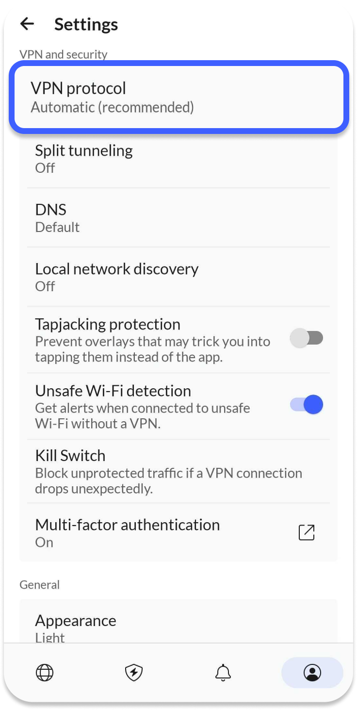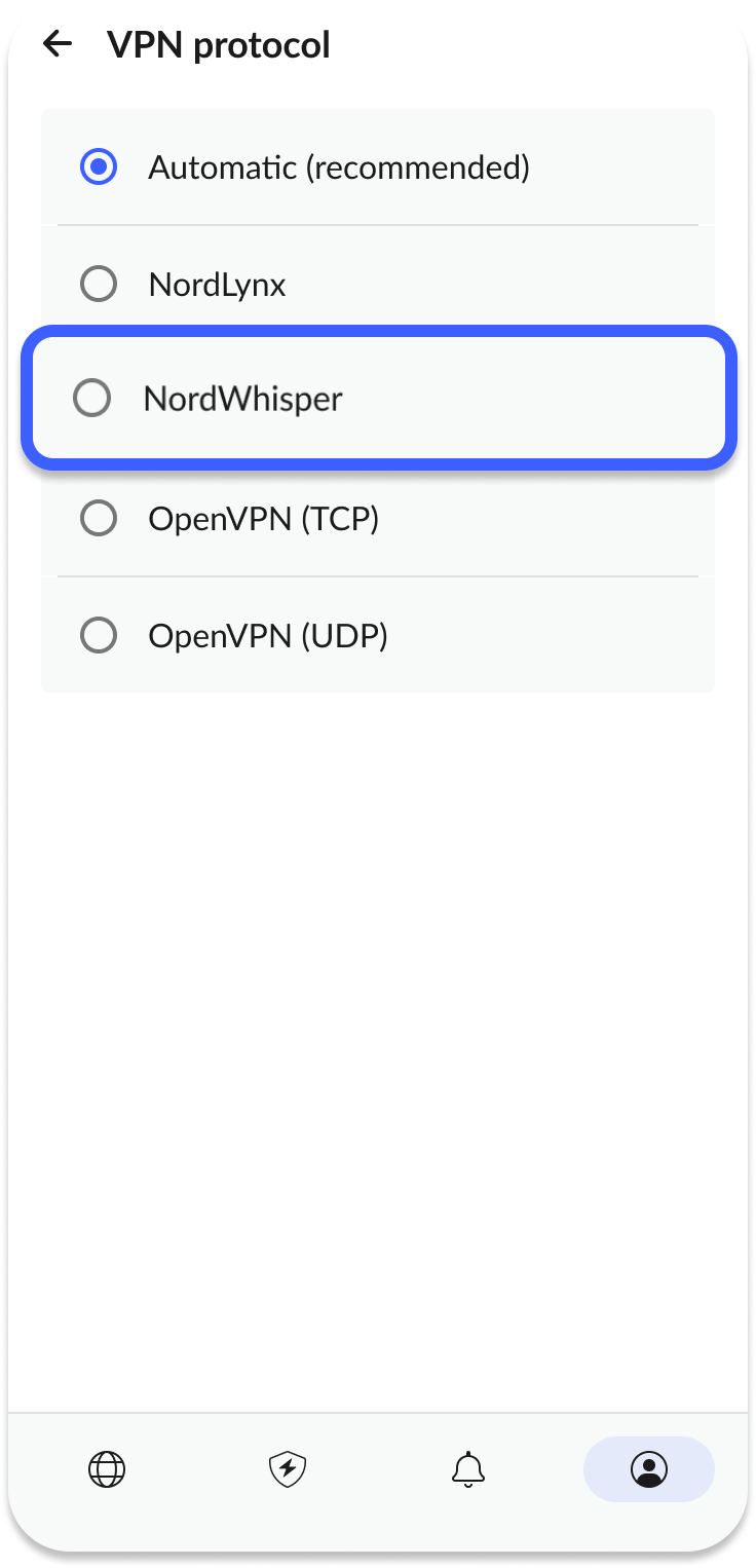 Lors de votre prochaine connexion, vous serez connecté au VPN avec le protocole NordWhisper sur votre appareil Android.