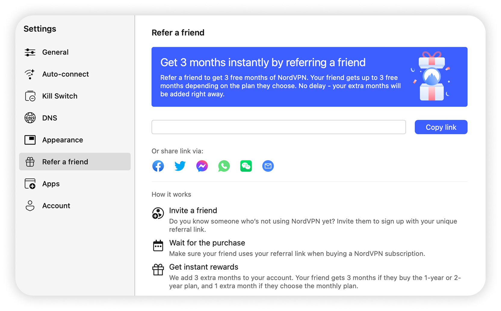 Nella scheda Invita un amico trovi il tuo link di referral personale e le istruzioni per invitare i tuoi amici a usare NordVPN.