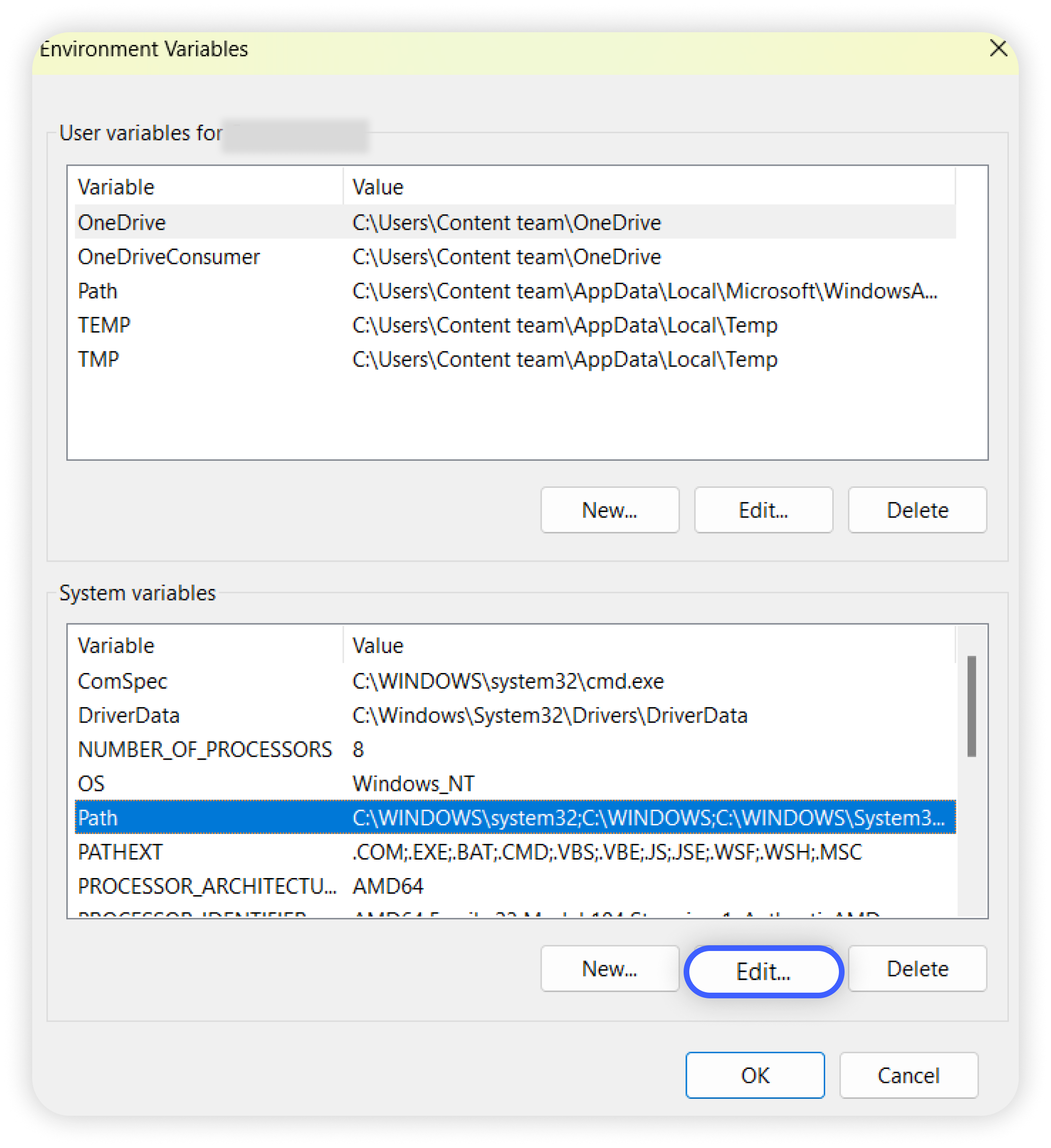 - Clicca su Variabili d'ambiente. Nella sezione Variabili di sistema, individua la variabile d'ambiente "PATH" e selezionala. Clicca su Modifica. Se la variabile d'ambiente "PATH" non esiste, clicca su"Nuova...".