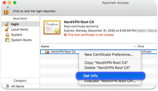 - Nella finestra Accesso Portachiavi, nel portachiavi dei login, clicca col tasto destro sul certificato NordVPN Root CA e seleziona Ottieni informazioni.