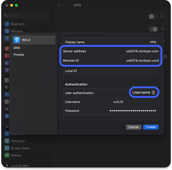 Per i campi della voce Autenticazione, seleziona Nome utente e inserisci il tuo nome utente e la password del servizio NordVPN.