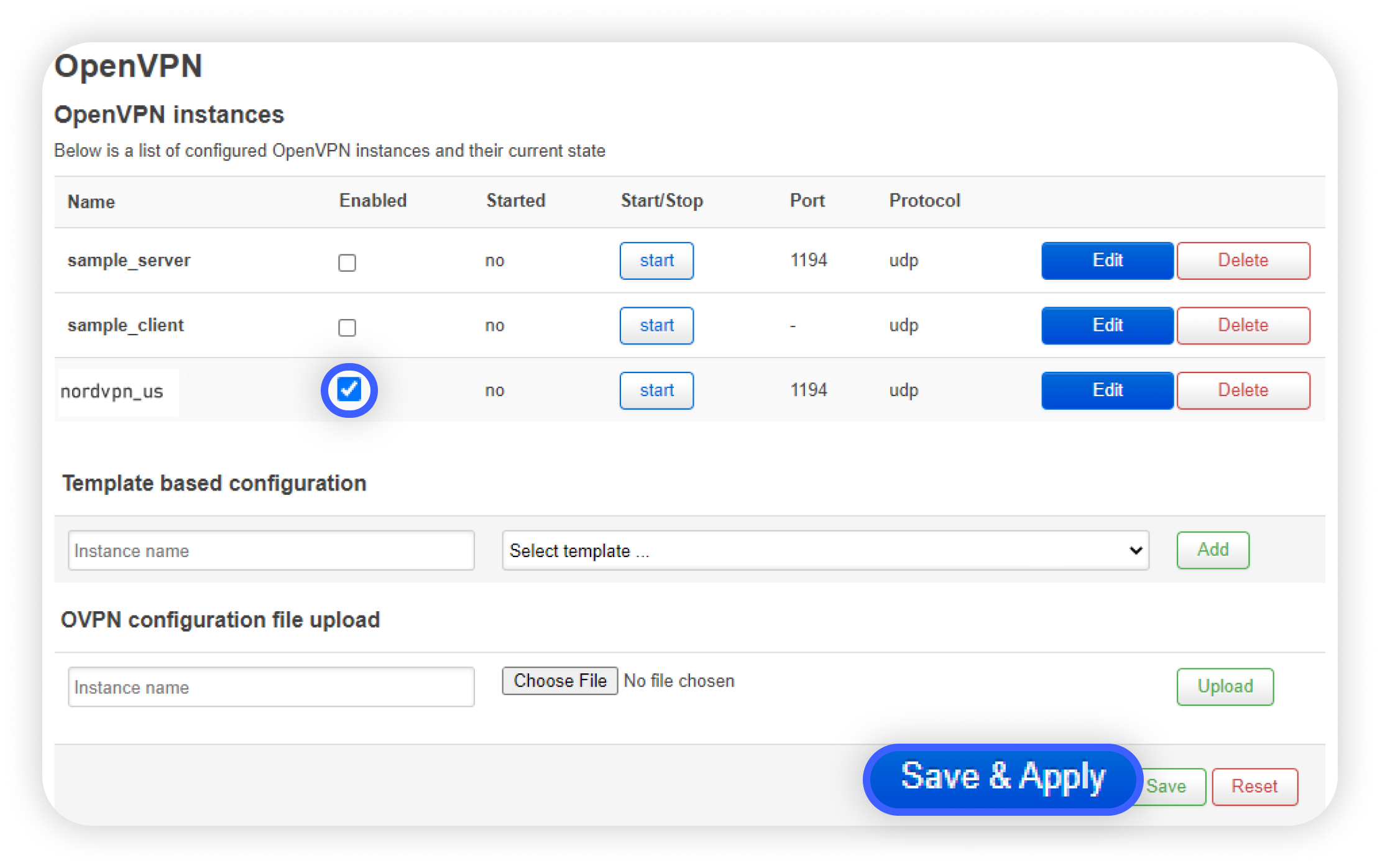 Instance name (nell'esempio, l'abbiamo chiamata "nordvpn_us"). Poi clicca sul pulsante Choose File, individua il