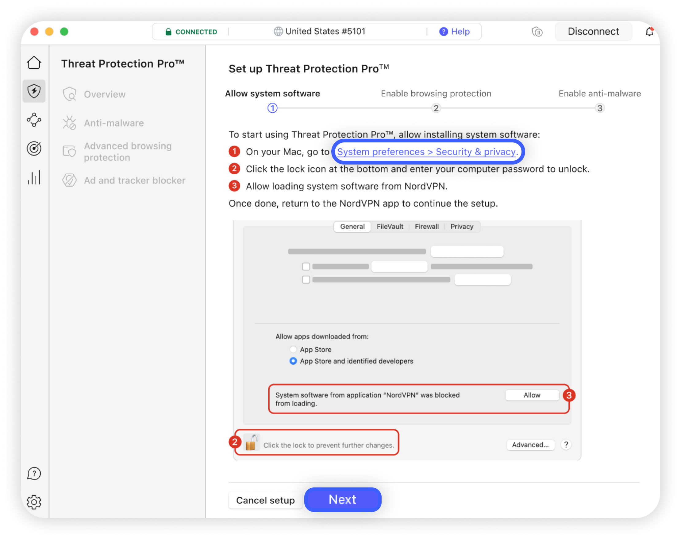 Quando utilizzi un'applicazione nativa di NordVPN, puoi configurare Threat Protection Pro™ su macOS Ventura e Sonoma in pochi passaggi: