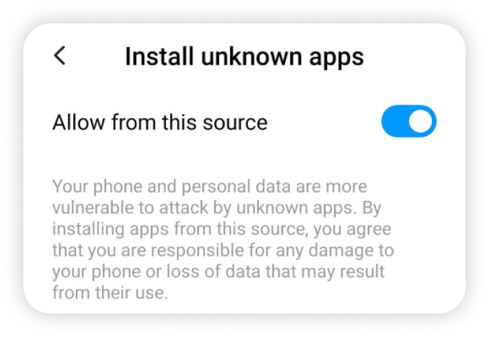 Android バージョン7.0以下では、設定 > セキュリティ > 不明なソース(Unknown sources)に移動するとこのオプションを見つけることができます。