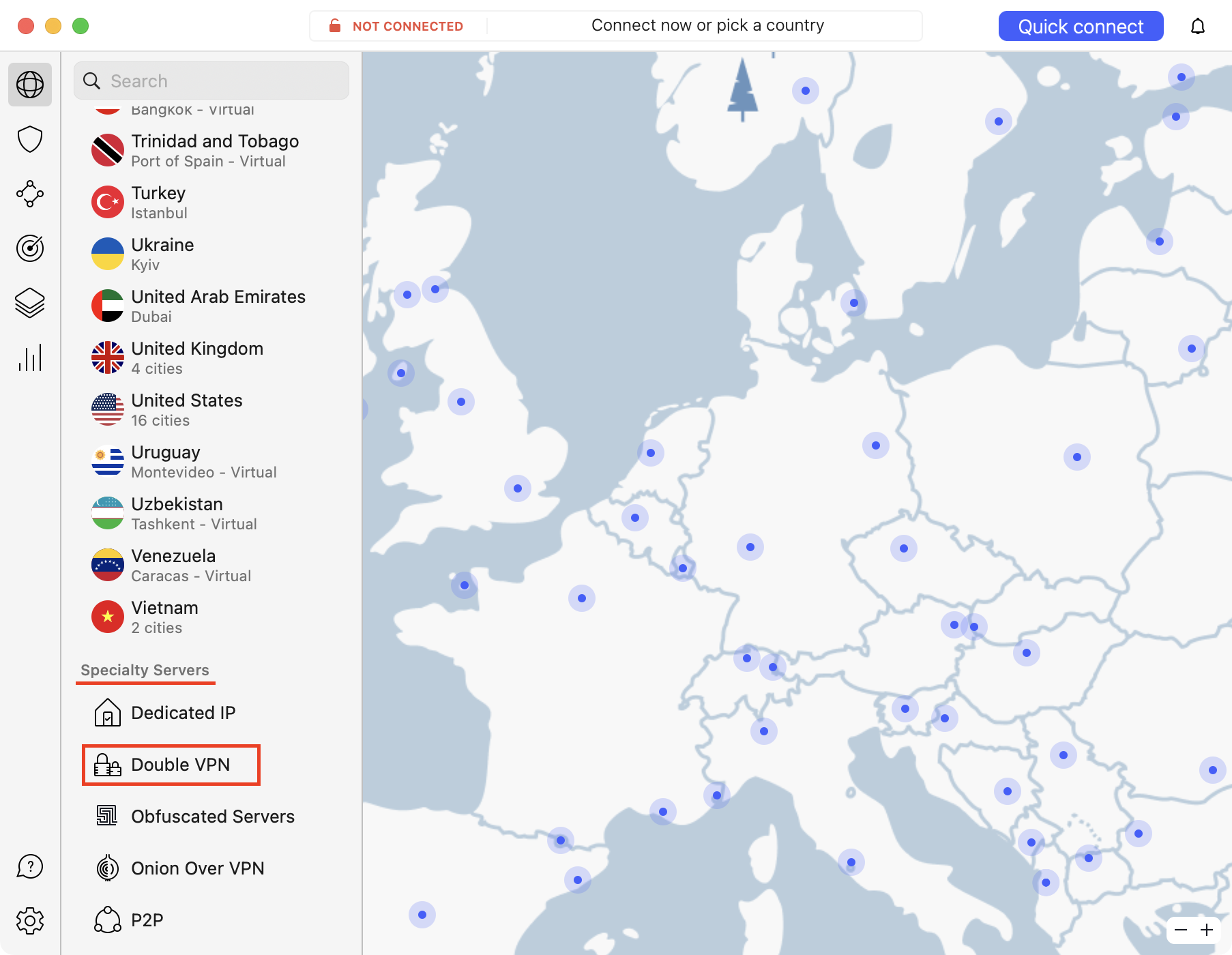 Double VPNサーバーの使用を開始するには、NordVPNアプリ内で特殊サーバーカテゴリーを開き、Double VPNをクリックします。 利用可能な最高速のサーバーに自動的に接続されます。