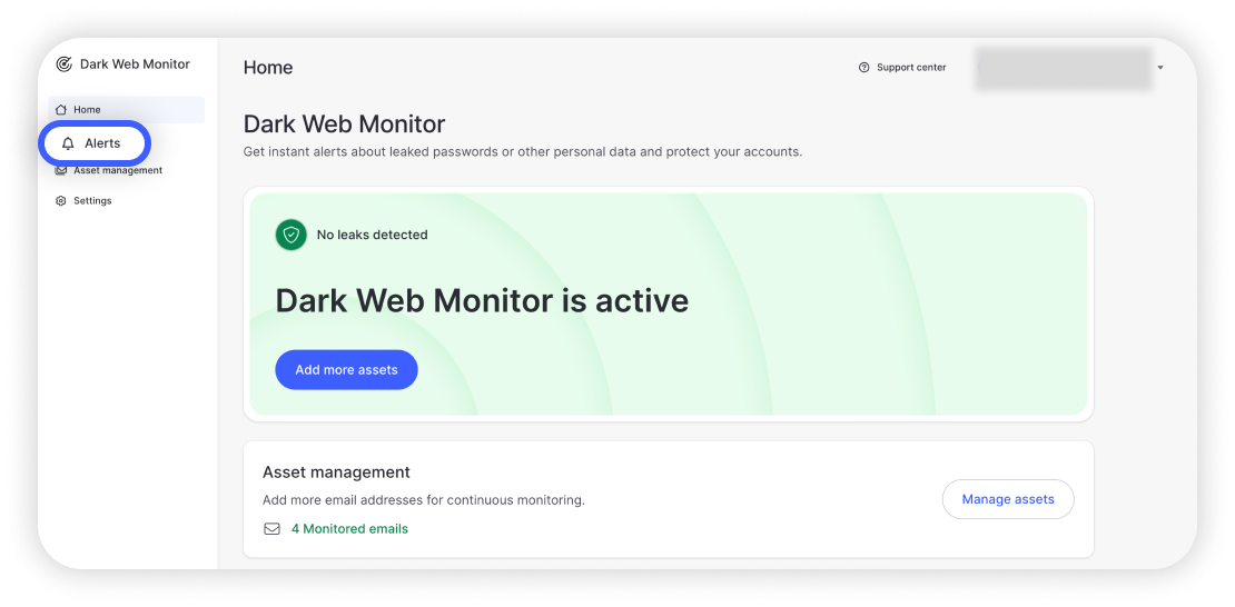 このページでは、自分のデータに関する新しい警告があるかどうかを確認できます。注意:このページでダークウェブモニタリングを有効にすることもできます。