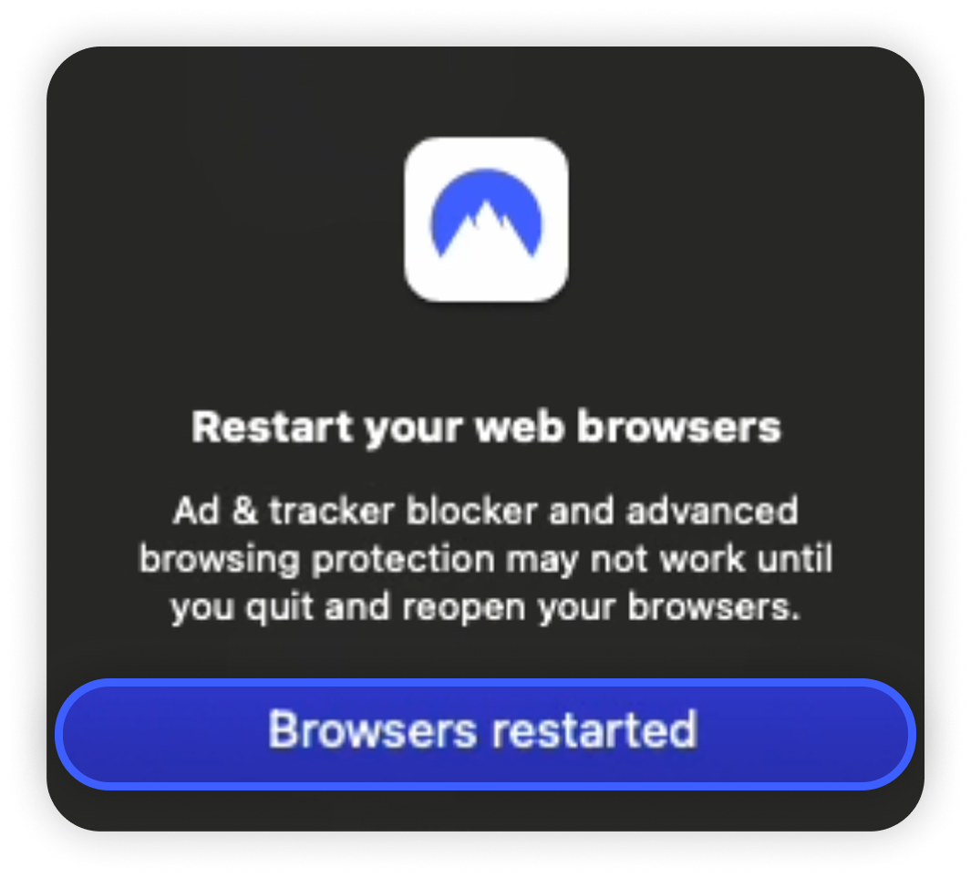 最後に、「ブラウザ再起動(Browsers restarted)」ボタンをクリックして、脅威対策Pro™のセットアップを終了します。
