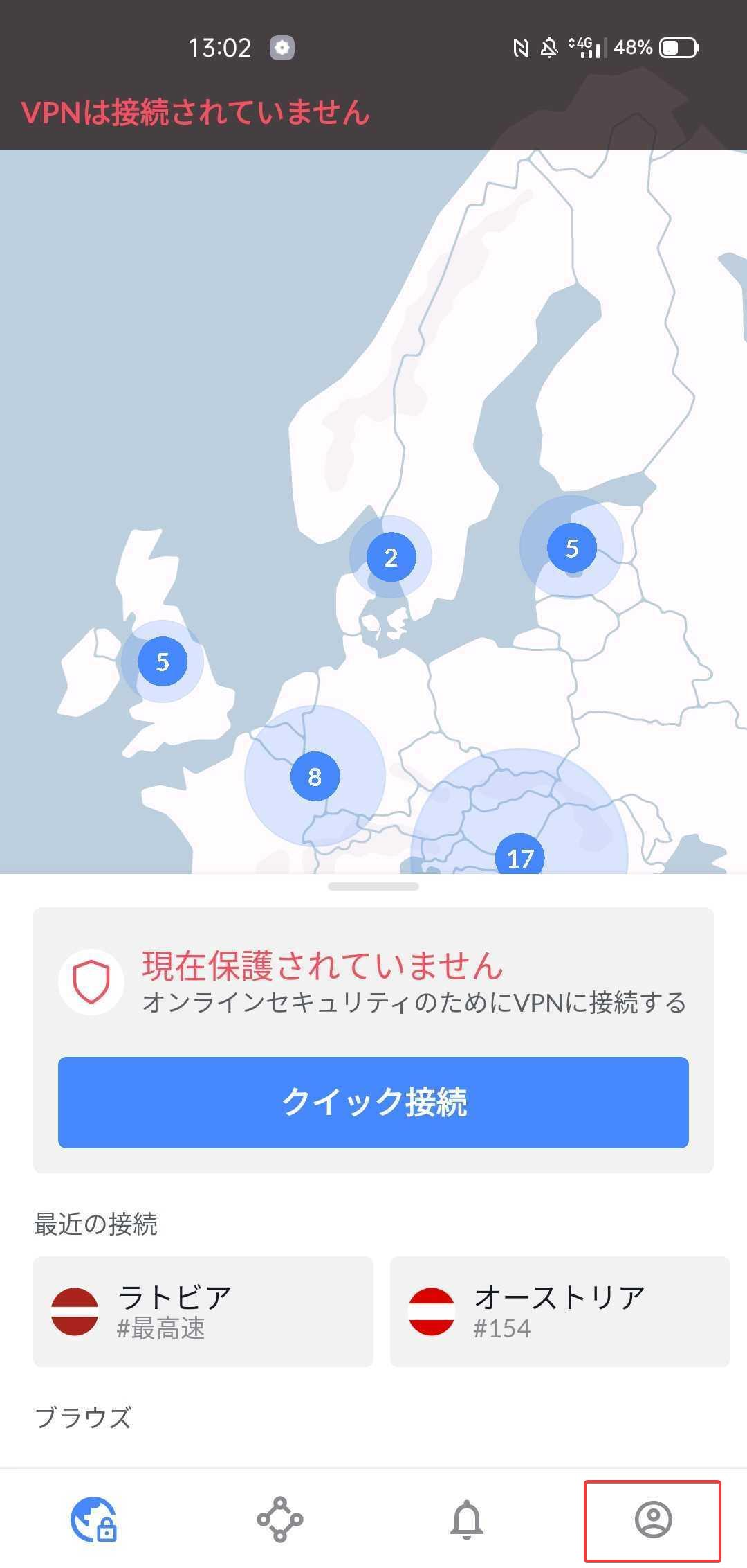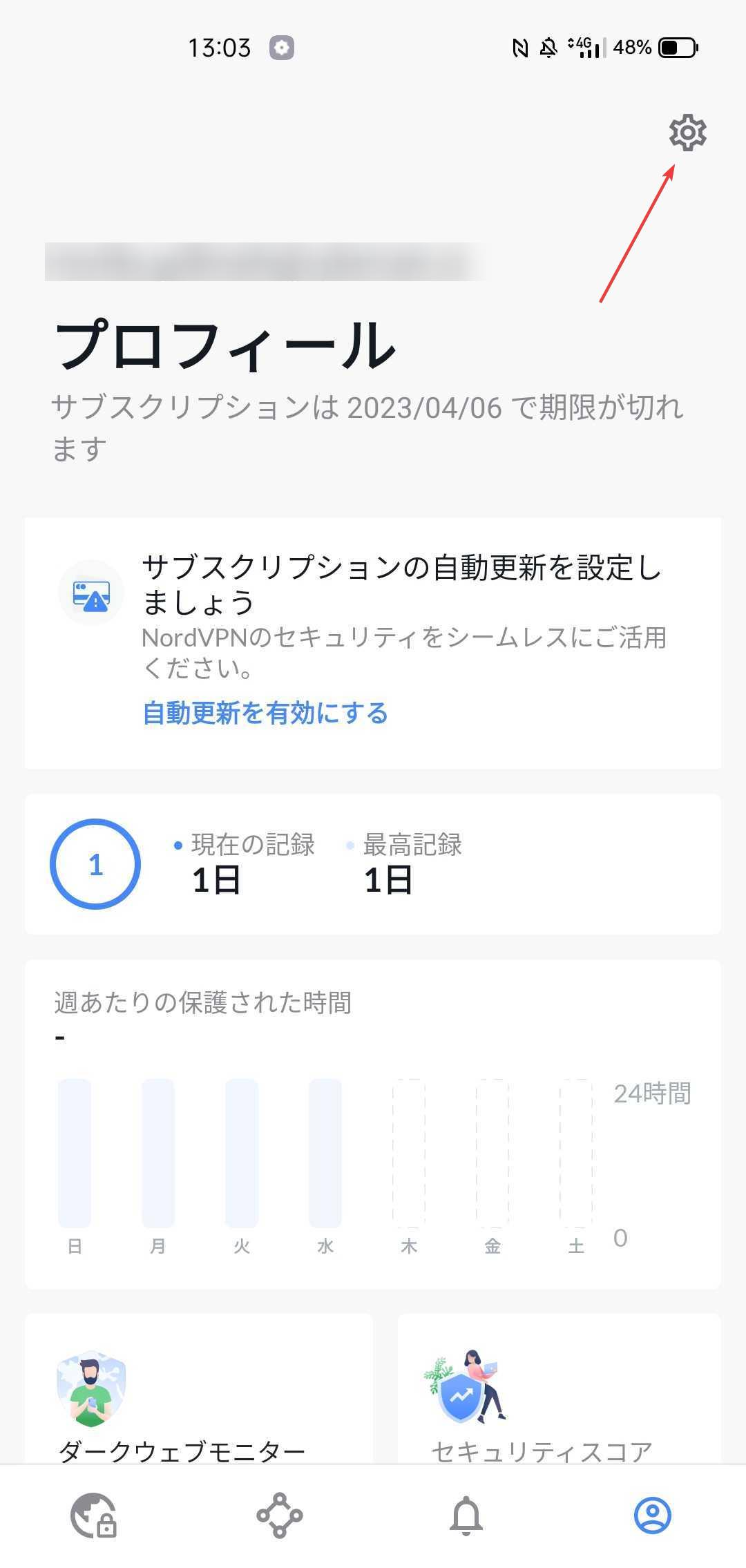 右下の「アカウントとアプリの設定」に移動し、右上の歯車アイコンをタップします。
