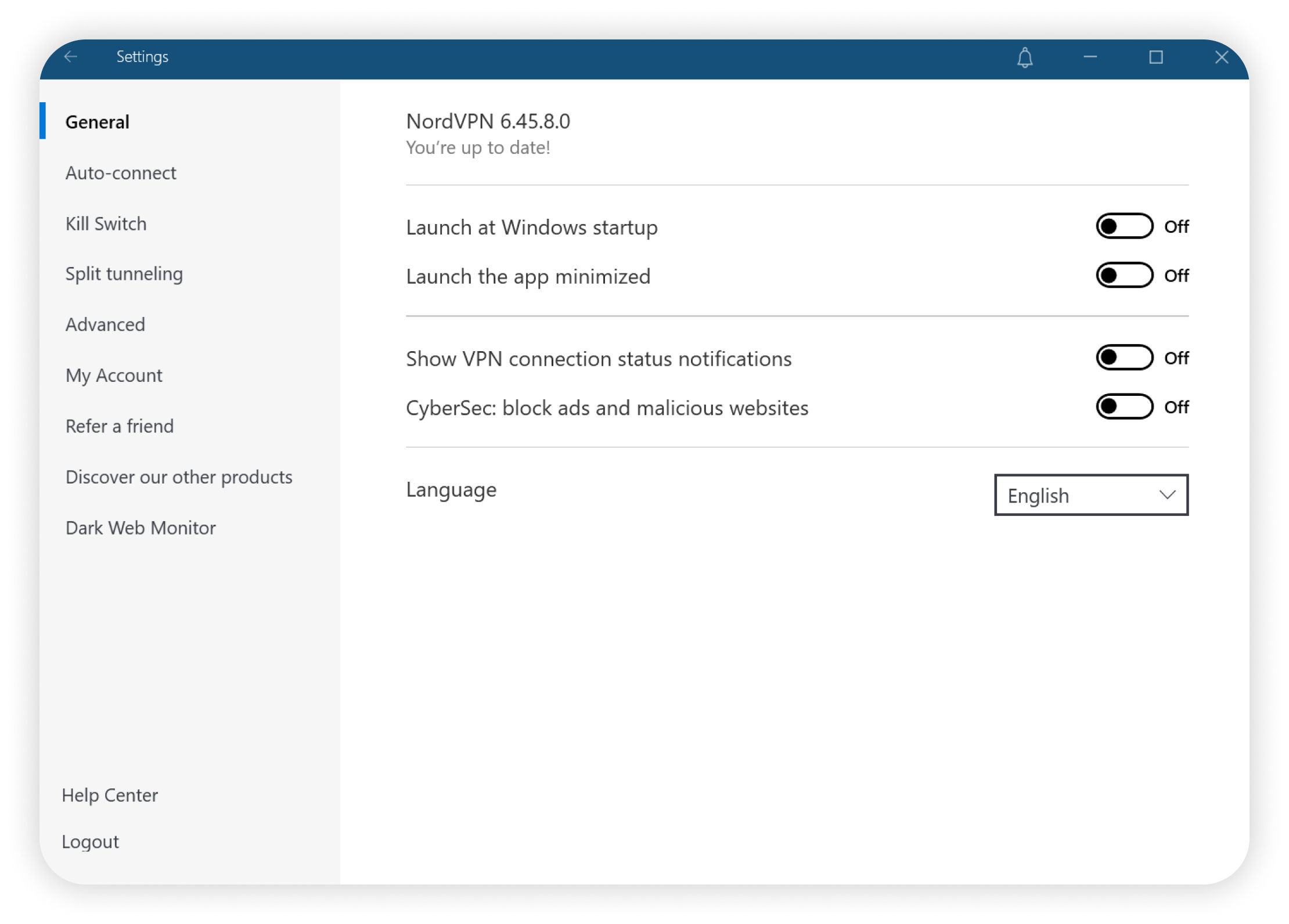 - 앱을 최소화하여 실행(Launch the app minimized)은 컴퓨터 시작 시 (메인 창을 여는 대신) NordVPN 아이콘을 Windows 시스템 표시줄에만 표시합니다.기본적으로 활성화되어 있습니다.