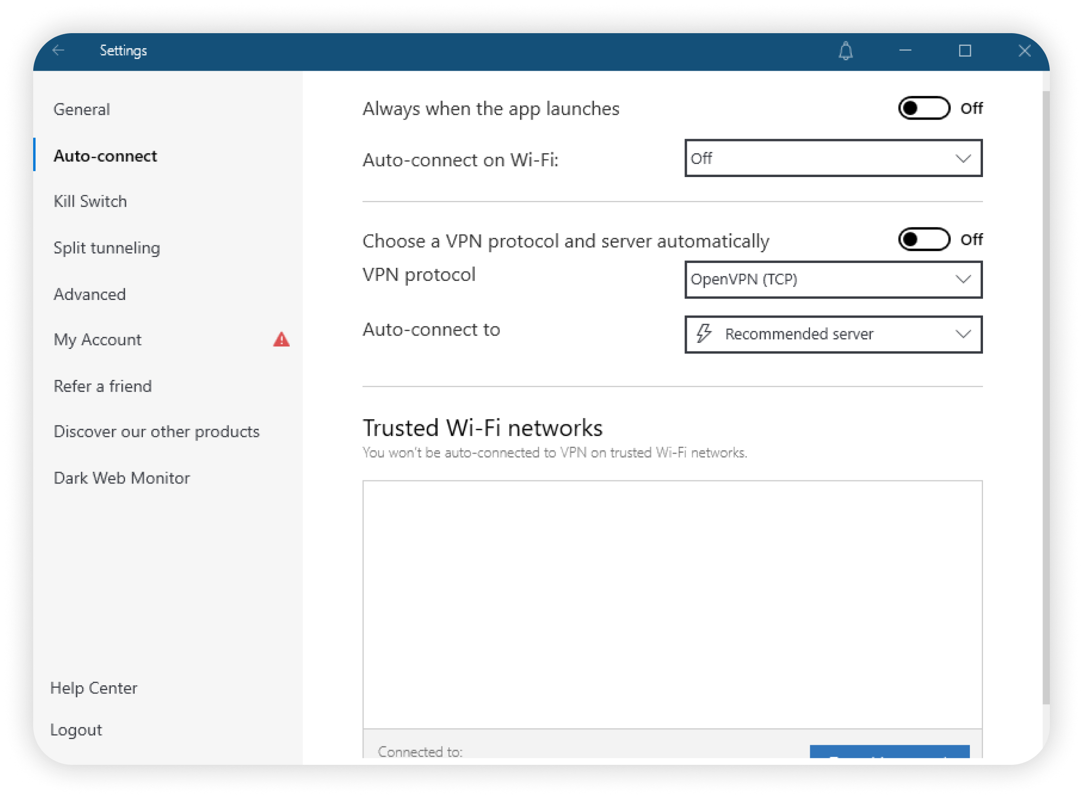 - Wi-Fi일 때 자동 연결(Auto-connect on Wi-Fi): 이 옵션은 네트워크에 연결 시 앱이 자동으로 서버에 연결하도록 합니다. 안전하지 않은 네트워크(Unsecure networks) 또는 항상(Always)으로 설정할 수 있습니다. 이 기능은 기본적으로 꺼져 있습니다. 안전하지 않은 네트워크: 안전하지 않은 Wi-Fi 네트워크에 연결 시 자동으로 서버에 연결합니다. 안전하지 않은 무선 네트워크는 비밀번호가 없거나 암호화 수준이 약한 네트워크입니다. 이 기능은 새로운 Wi-Fi 네트워크에 연결하거나 네트워크를 전환할 때만 작동합니다. 이더넷 연결이나 신뢰할 수 있는 Wi-Fi 네트워크에는 적용되지 않습니다. 이 설정을 켜더라도 자동 연결 후 연결을 끊을 수 있습니다. 항상: Wi-Fi 네트워크에만 적용됩니다. 신뢰할 수 없는 Wi-Fi를 사용하는 경우, 앱이 자동으로 서버에 연결하도록 합니다. 사용 중인 Wi-Fi를 신뢰할 수 있거나 자동 연결을 끄지 않는 한 연결을 끊을 수 없습니다.