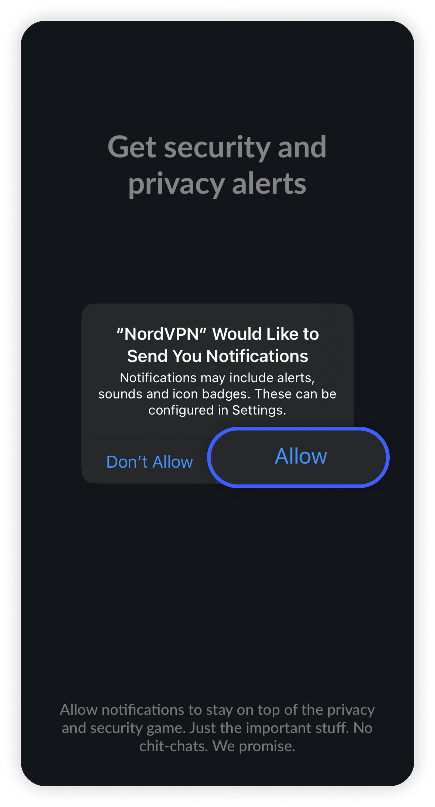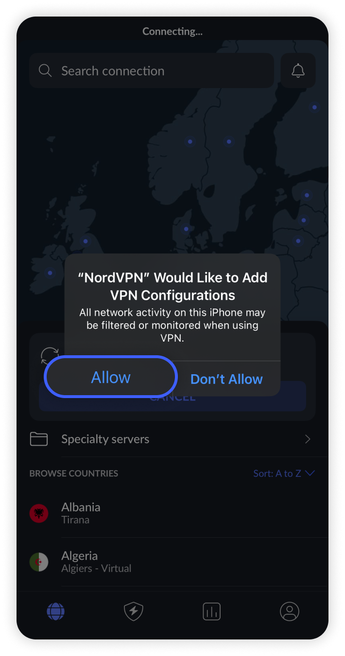 2. 처음으로 연결하는 경우, NordVPN이 VPN 구성을 추가하도록 허용하라는 메시지가 뜹니다. 이는 일반 경고 메시지이며, VPN 구성은 VPN 서버에 연결하는 데 필요합니다. NordVPN은 공신력 있는 VPN 서비스 제공업체이므로, 허용(Allow)을 눌러 계속합니다.