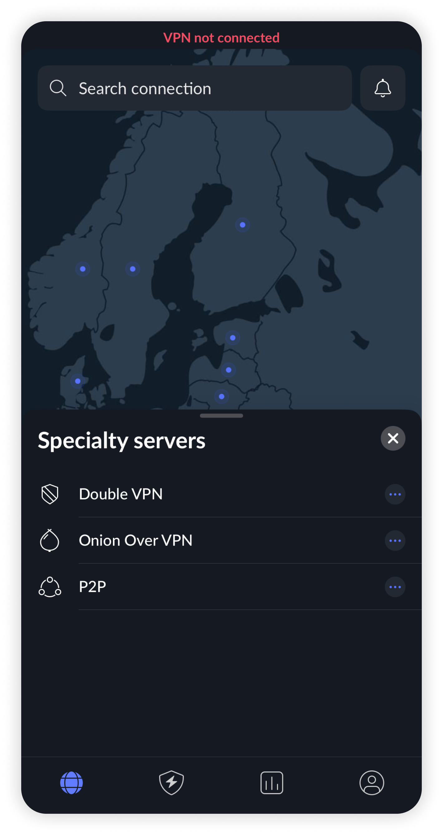 2. 선택된 국가 핀이 없을 때는 앱 하단에서 화면을 위로 밀어 사용 가능한 국가와 특수 서버(specialty servers)를 모두 확인할 수 있습니다. 그다음, 선택한 국가를 눌러 자동으로 서버에 연결합니다.