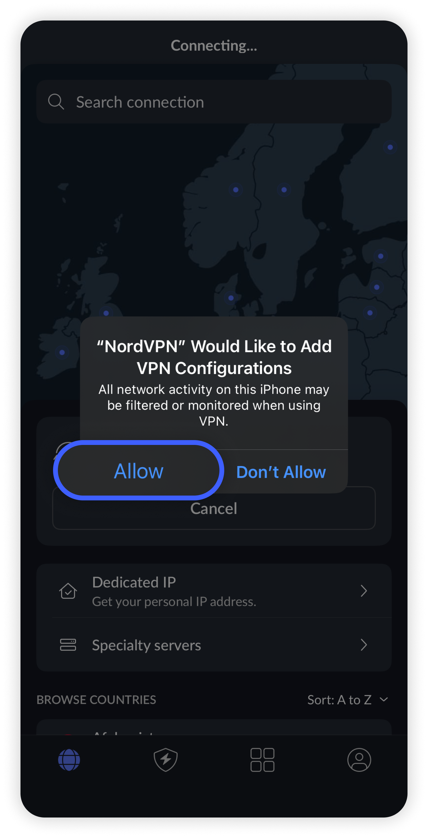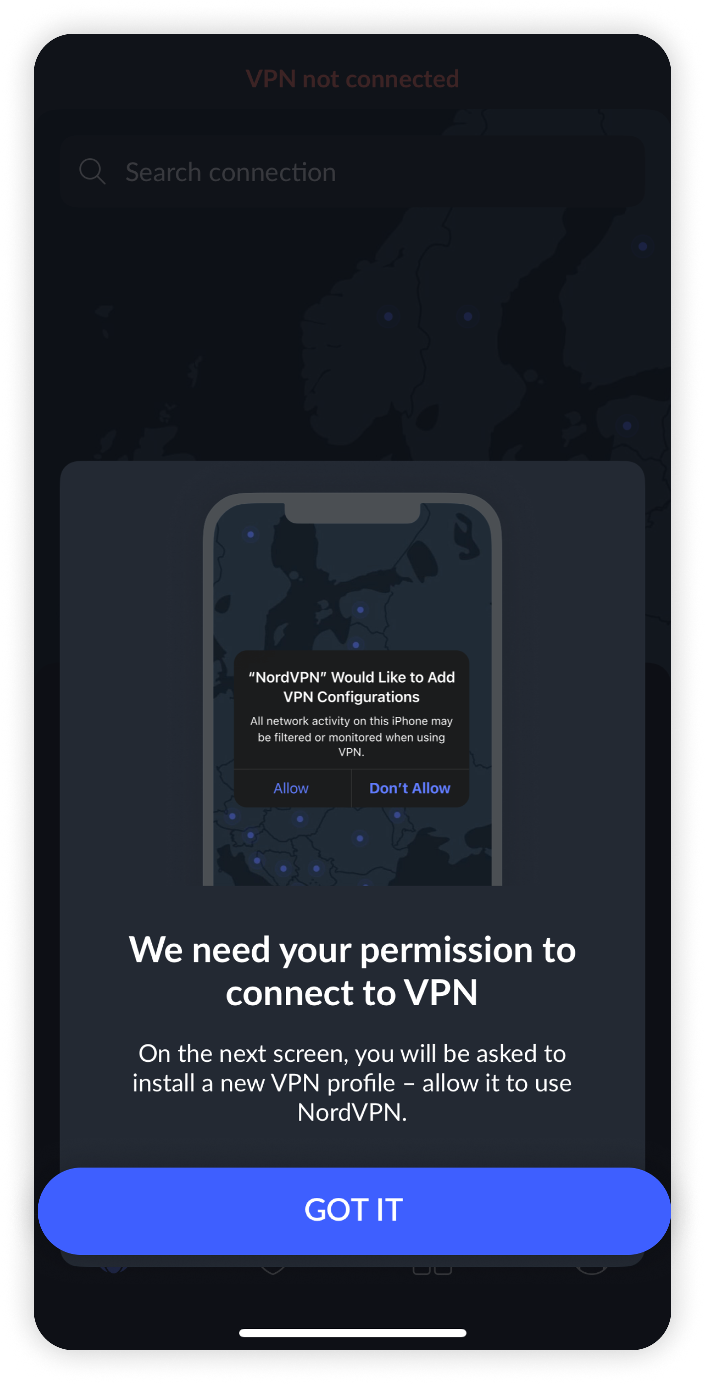처음 연결할 때 NordVPN은 새 VPN 프로필을 설치하려면 권한을 허용해야