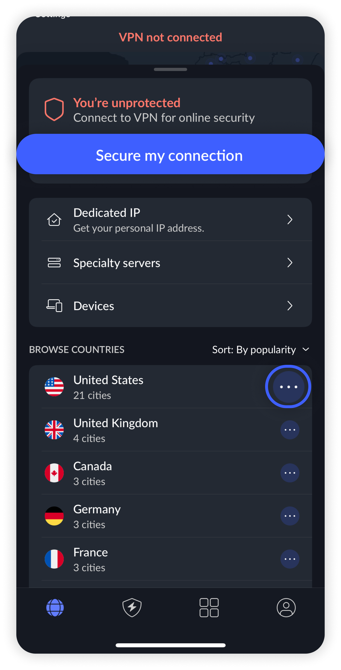 국가 핀을 탭하고 '연결 보호하기'를 누르면 해당 국가에서 가장 적합한