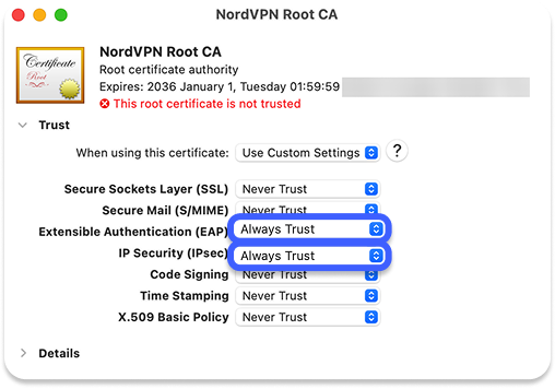 NordVPN Root CA에서, 신뢰(Trust) 섹션을 클릭하고 IP 보안(IP Security(IPSec)) 및 EAP(Extensible Authentication) 필드를 항상 신뢰(Always Trust)로 설정합니다. 나머지 필드는 모두 신뢰하지 않음(Never Trust)으로 둡니다. 변경 사항을 적용하려면 Mac 비밀번호를 입력해야 합니다. 완료되면, 키체인을 닫습니다.