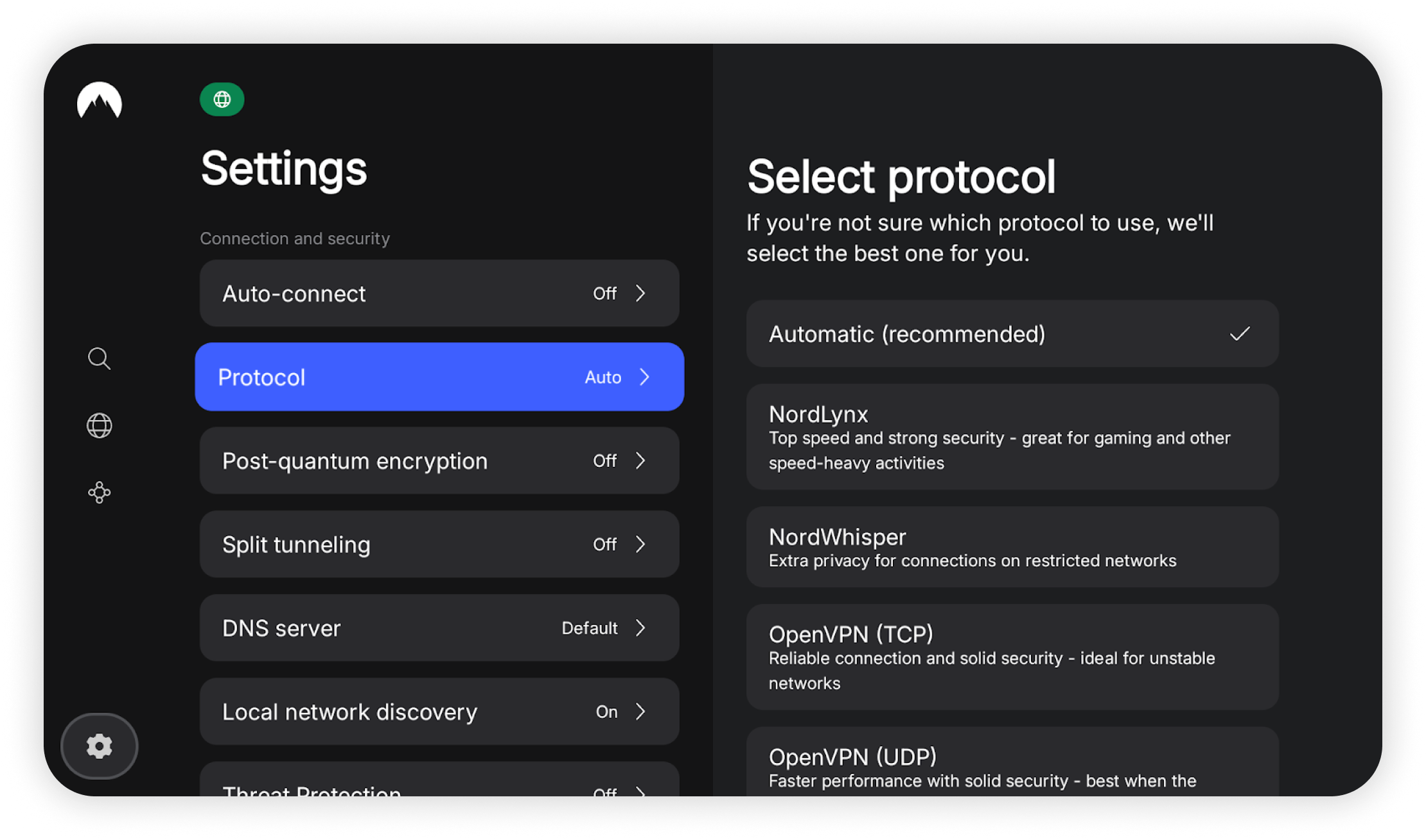 Nordlynx, NordWhisper, OpenVPN TCP, OpenVPN UDP 연결 프로토콜 사이를 전환합니다. 자세한 내용은 선택해야 하는 VPN 프로토콜에 대한 가이드를 참조하세요.