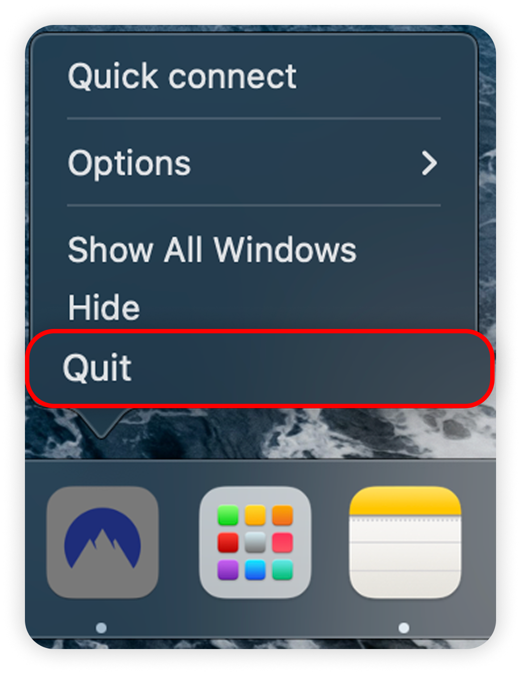 - Dock에서 NordVPN을 마우스 오른쪽으로 클릭하고 종료(Quit)를 선택하여 NordVPN 애플리케이션을 완전히 종료합니다.