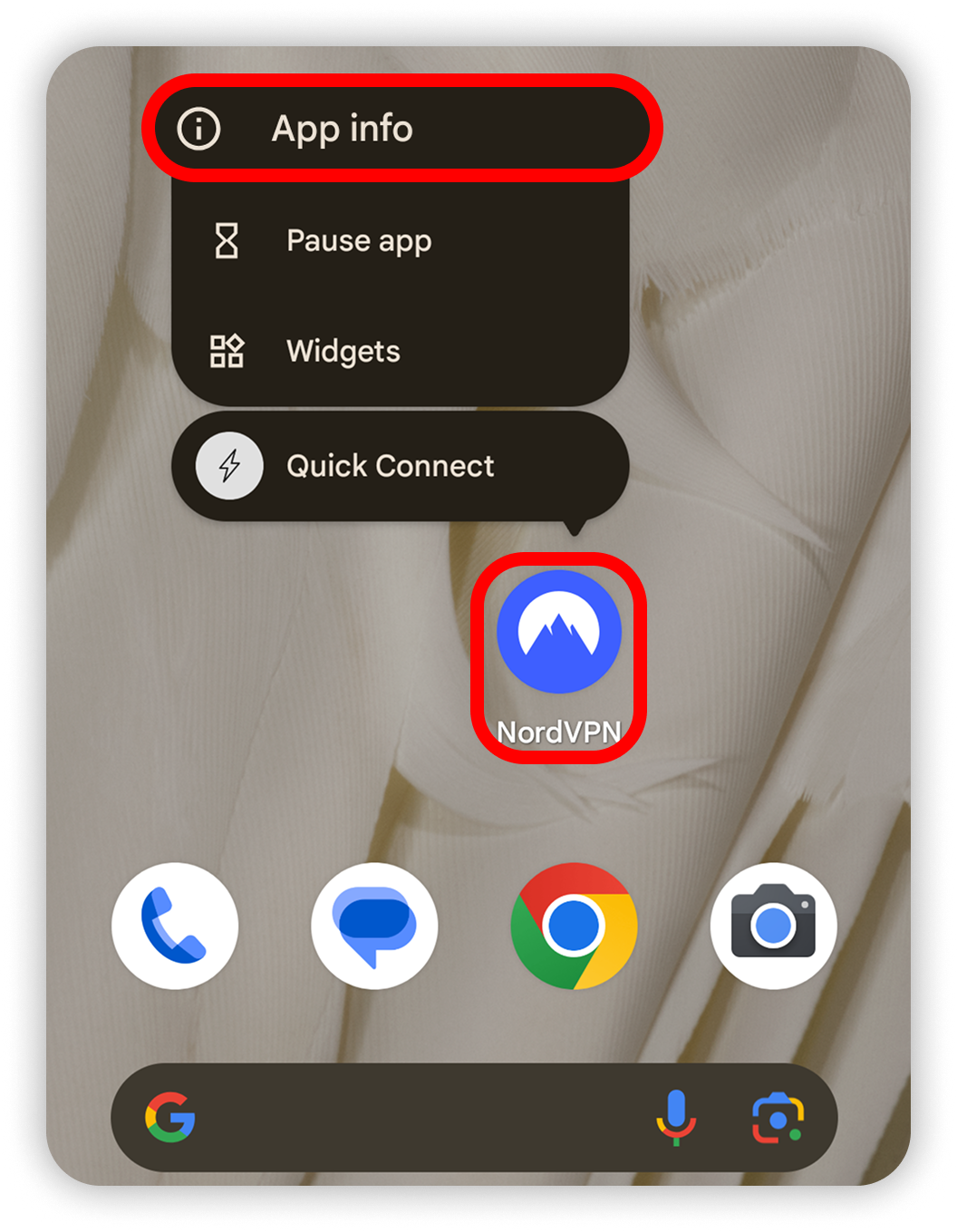 - 홈 화면에서 NordVPN 앱을 찾아 아이콘을 길게 누른 후 앱 정보(App info)를 선택합니다.