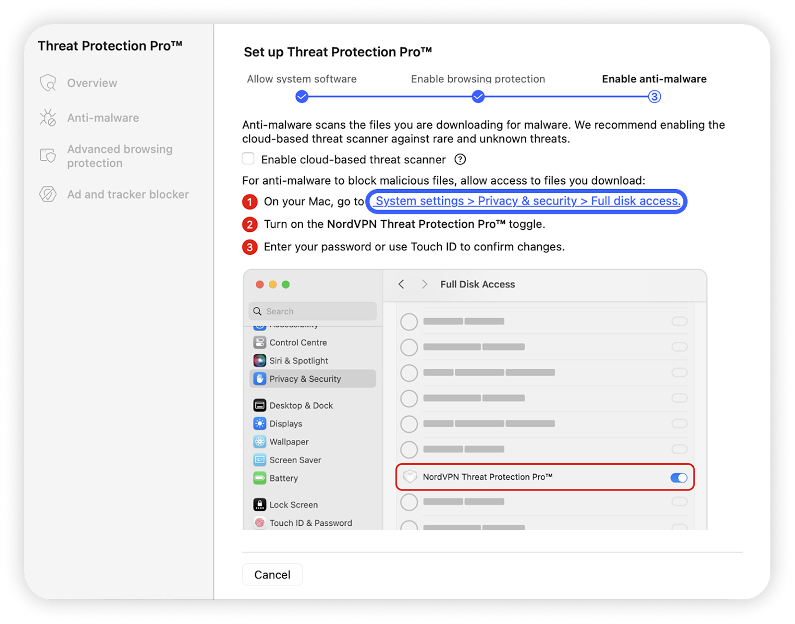 목록에서 'NordVPN 바이러스 및 위협 방지 Pro™'를 찾아 옆에 있는 토글