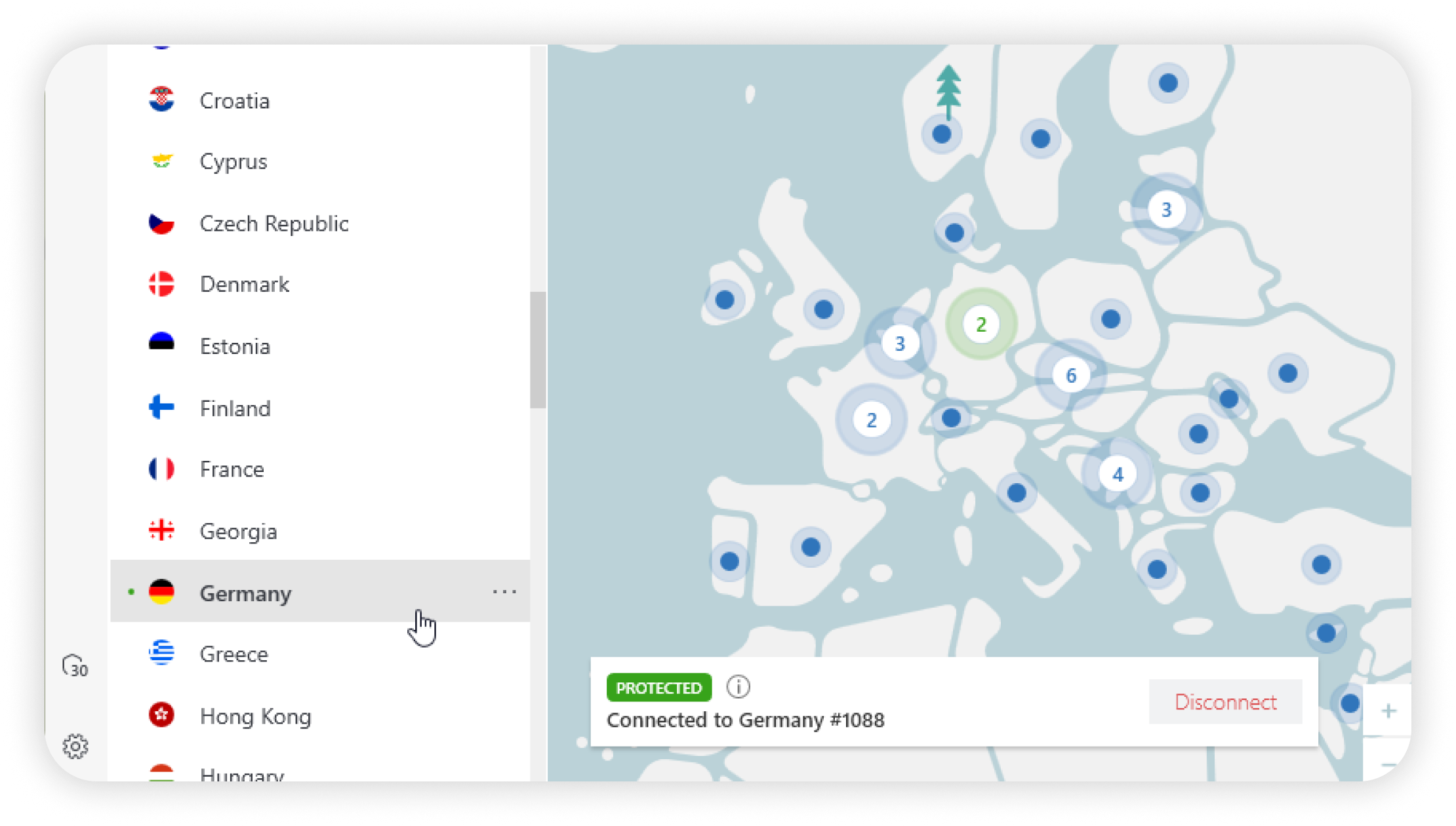 De lijst van Beschikbare landen of de kaart Servers gebruiken. Klik op de punten op de kaart of op het specifieke land in de lijst om verbinding te maken met de beste server voor de gegeven locatie.