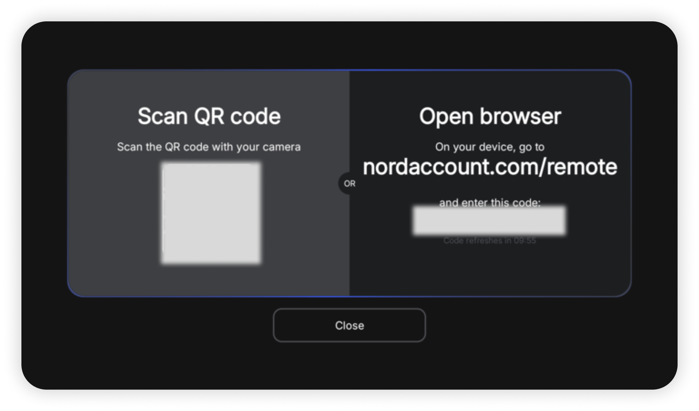 - Nadat je op Inloggen of Registreren hebt geklikt bij NordVPN op je tv met je account. Zoals in de schermafbeelding hieronder, zie je een QR-code die je moet scannen of een nummer voor validatie op afstand op je telefoon, laptop of pc: (https://support.nordvpn.com/hc/article_attachments/36788931556369)