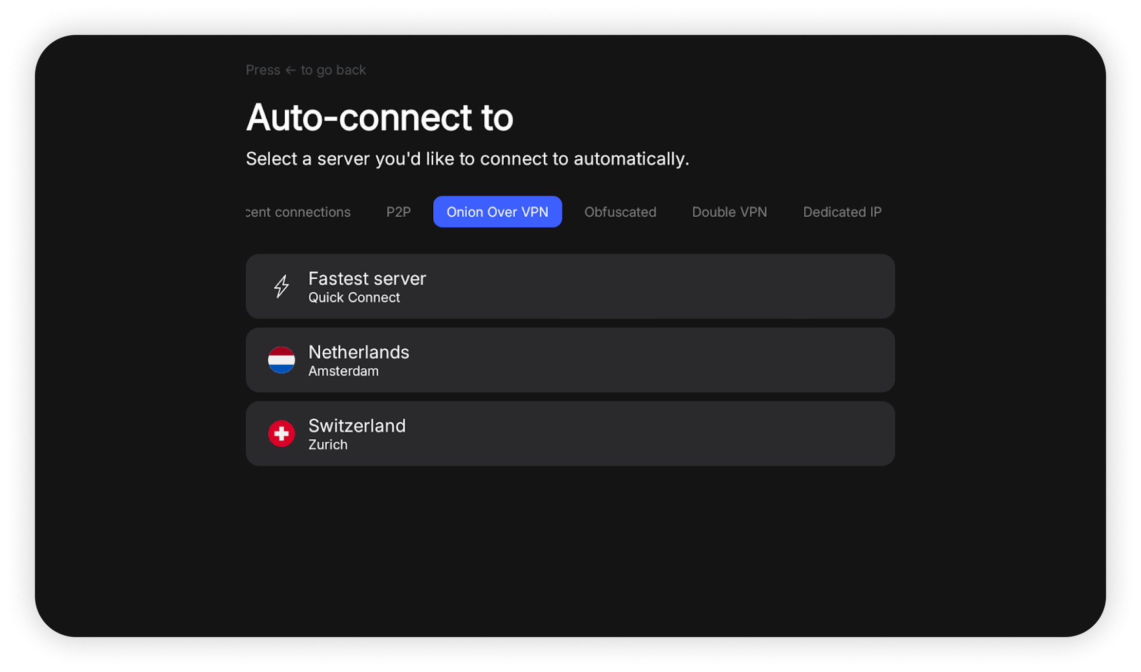 Met Automatisch verbinden kun je het land of het servertype van je voorkeur selecteren, waarmee de app automatisch verbinding maakt.