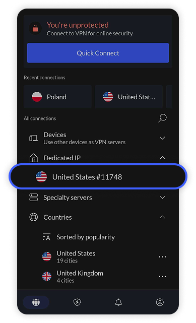 Een dedicated IP van NordVPN is een IP-adres dat is toegewezen aan een specifieke server, zodat het niet wordt gedeeld met een ander apparaat of netwerk. Met de dedicated IP van NordVPN krijg je verbeterde verbindingssnelheden en verbeterde beveiliging door exclusieve toegang.