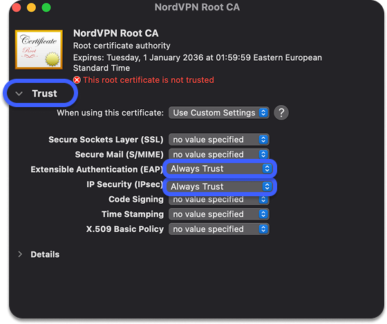 3. Klik onder NordVPN Root CA op de sectie Trust en stel de velden IP Security (IPSec) en Extensible Authentication (EAP) in op Always Trust. Laat alle andere velden op Nooit vertrouwen staan. Je moet je Mac-wachtwoord invoeren om deze wijzigingen door te voeren. Als je klaar bent, sluit je de sleutelhanger.