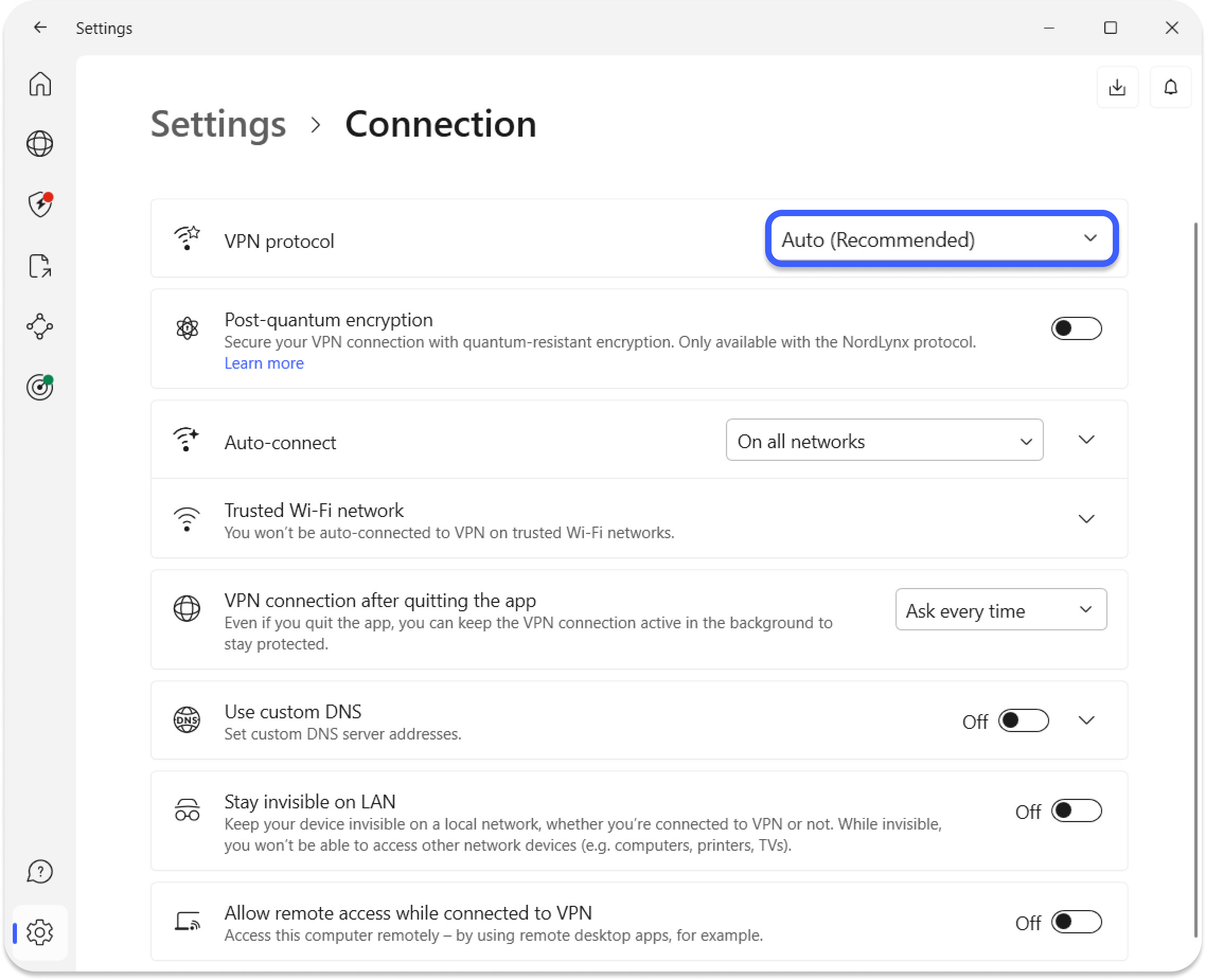 - Open de NordVPN-app en selecteer de knop Instellingen (tandwielpictogram) linksonder: (https://support.nordvpn.com/hc/article_attachments/37501426779281)