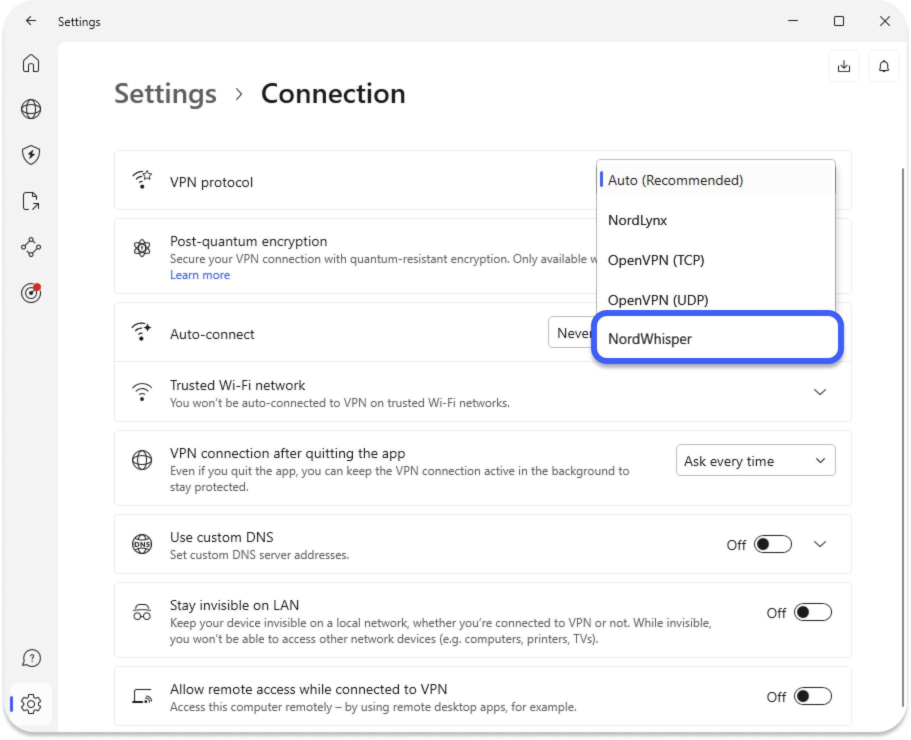 Volg deze stappen om het NordWhisper-protocol op je Windows-apparaat te gebruiken: