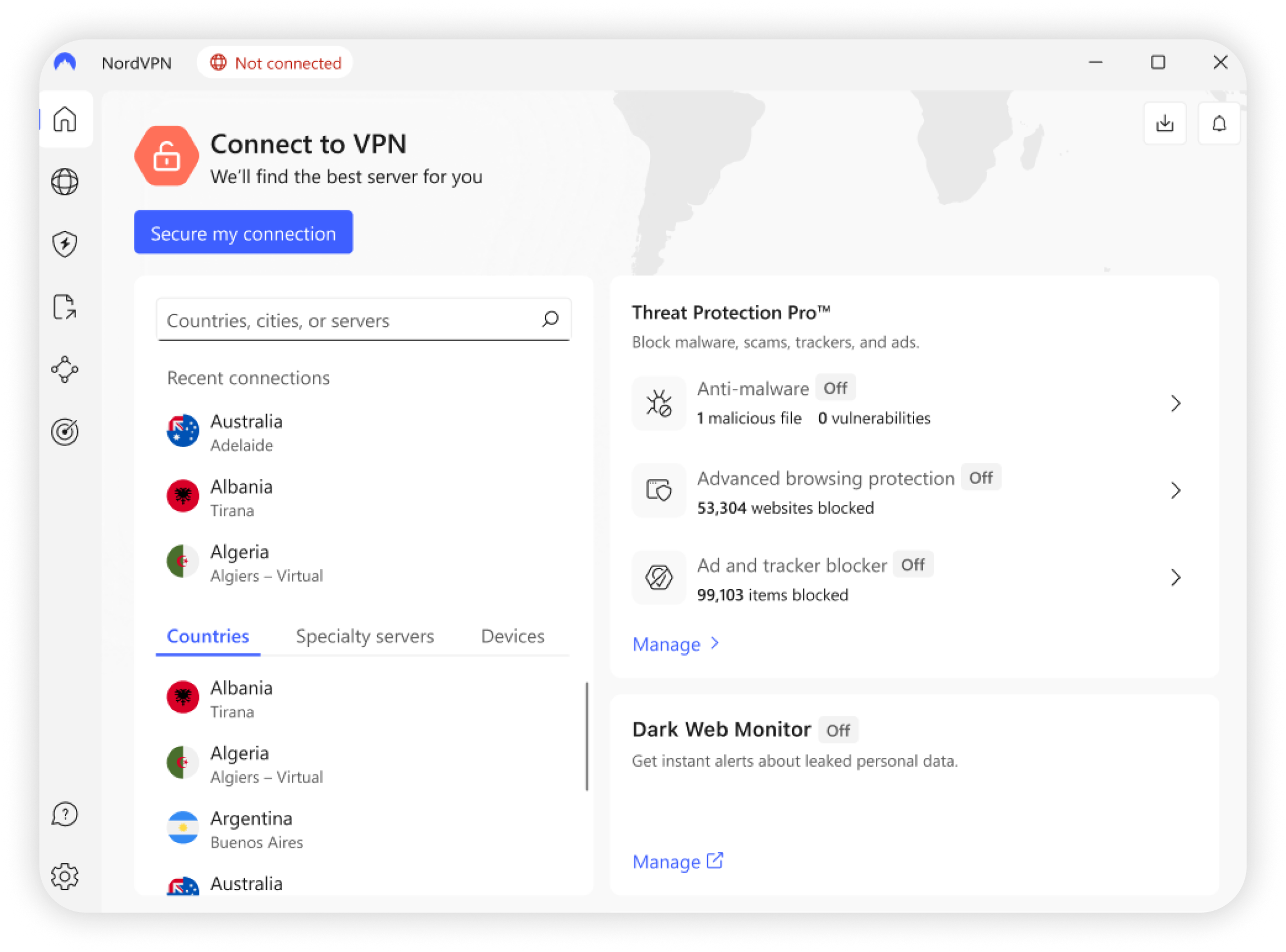 Når Threat Protection Pro™-funksjonen er slått på, blokkerer den automatisk annonser, sporere og ondsinnede URL-er. Når du besøker et nettsted som er kjent for å svindle folk, viser denne funksjonen et varsel i nettleseren for å advare deg om mulig svindel. Threat Protection Pro™ skanner også nedlastinger for malware, sjekker appene dine for sikkerhetssårbarheter og lar deg velge om du vil slette filer som inneholder malware. Threat Protection Pro™ er tilgjengelig med utvalgte NordVPN-abonnementer, og kan fungere uten en aktivert VPN-tilkobling. Du kan lese mer om Threat Protection på nettstedet vårt.