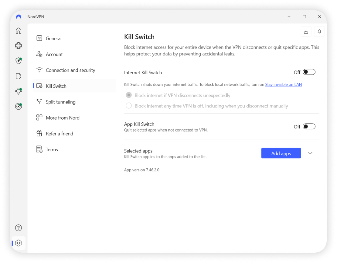 - Internet Kill Switch kutter internettforbindelsen din når du kobler deg fra sikre NordVPN-servere. Du kan konfigurere den til å slå seg av selv om du kobler fra VPN-et manuelt, men funksjonen er av som standard.