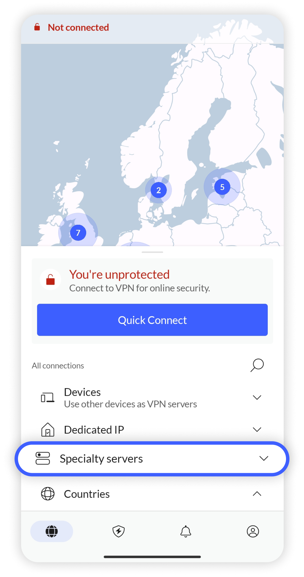 - Etter at du har byttet protokoll, velger du spesialservere (specialty servers) på startskjermen: