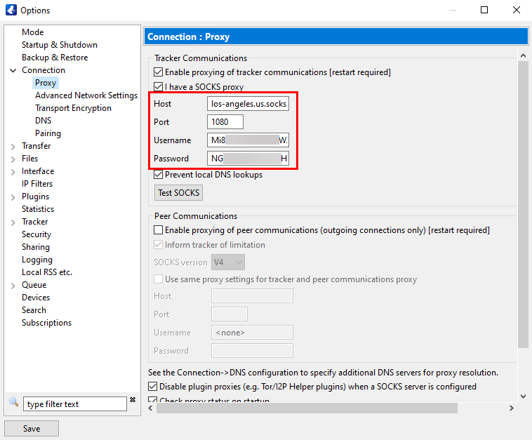 - Under Tracker communications, select the Enable proxying of tracker communications [restart required] and I have a SOCKS proxy checkboxes.