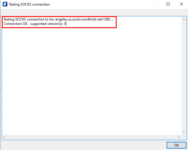 - A Testing SOCKS connection window will appear. If the connection was successful, you should see the following result: Connection OK - supported version(s): 5.
