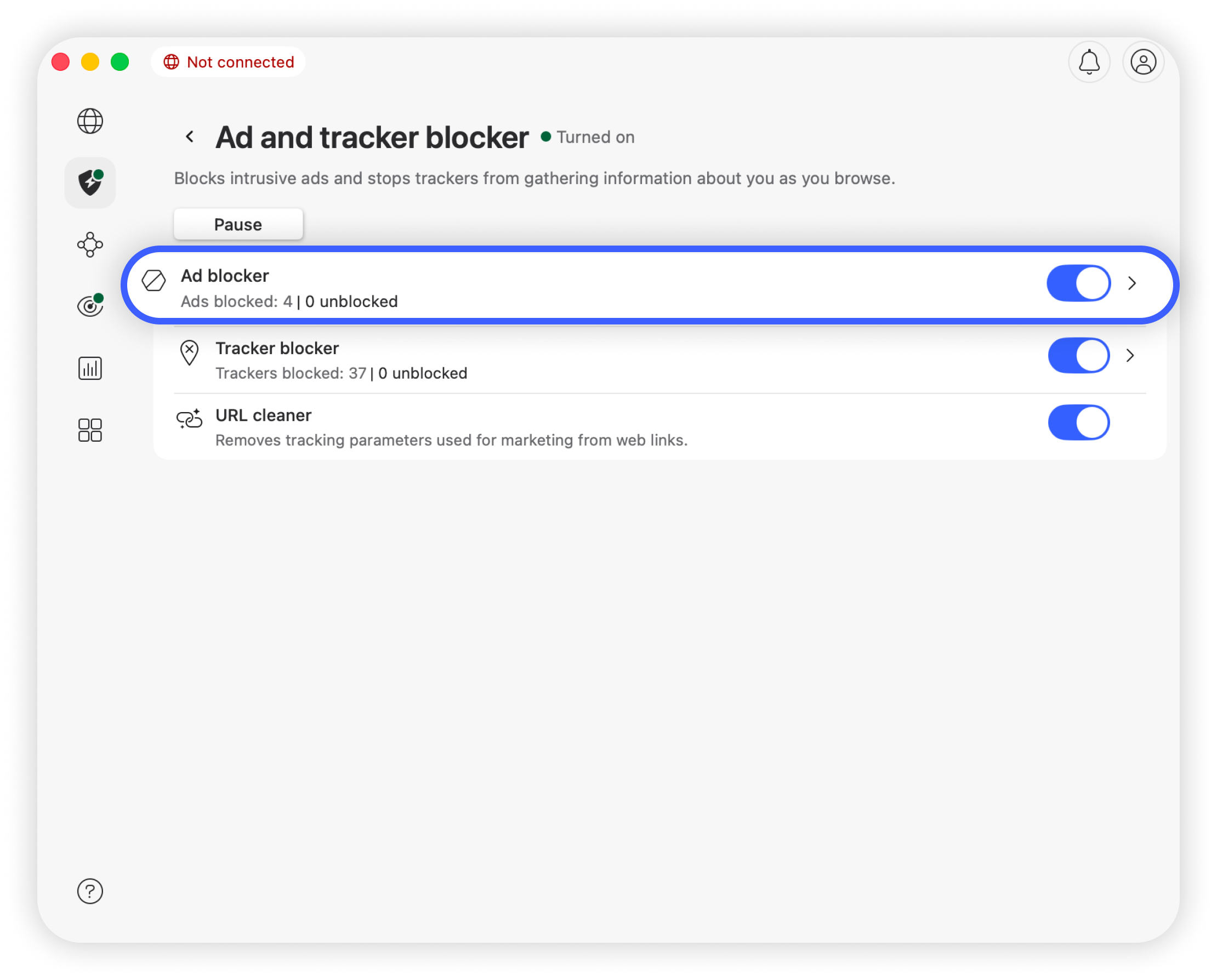 - Aktiver «Annonseblokkering» ved å klikke på bryteren: