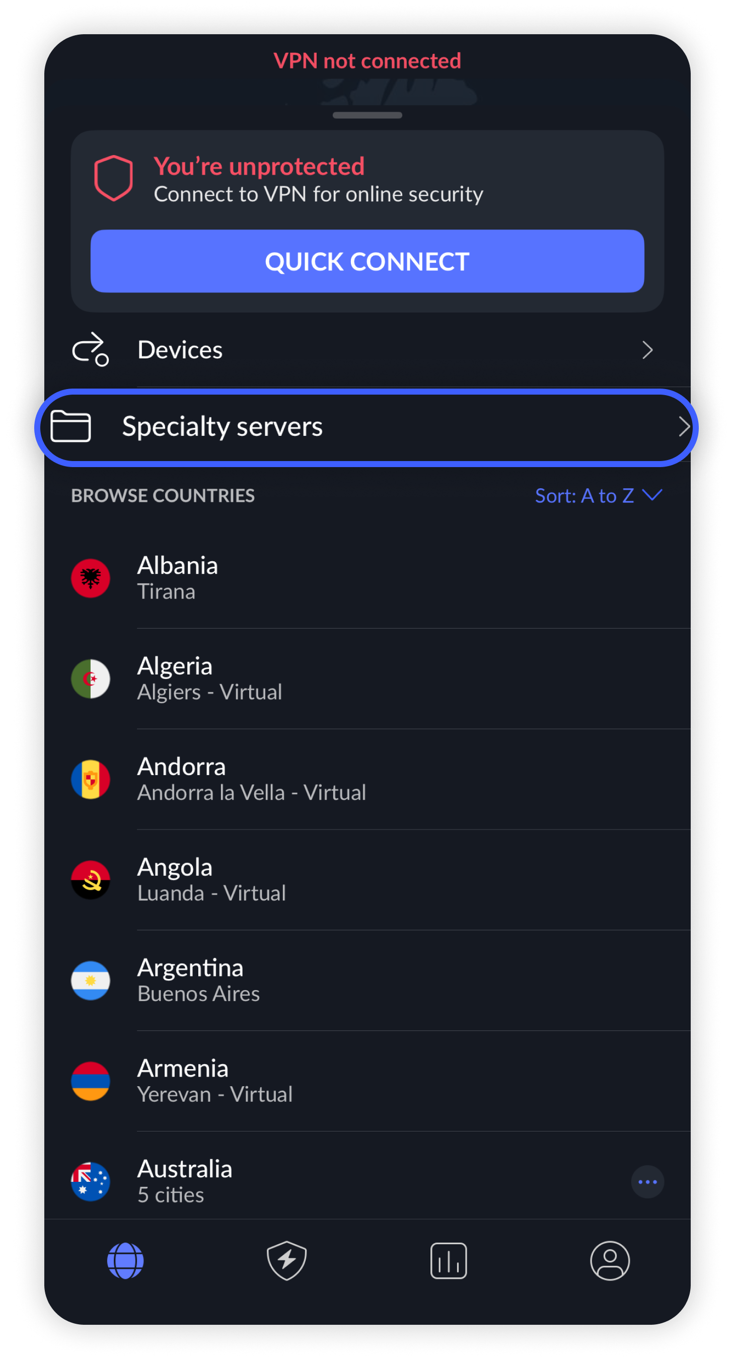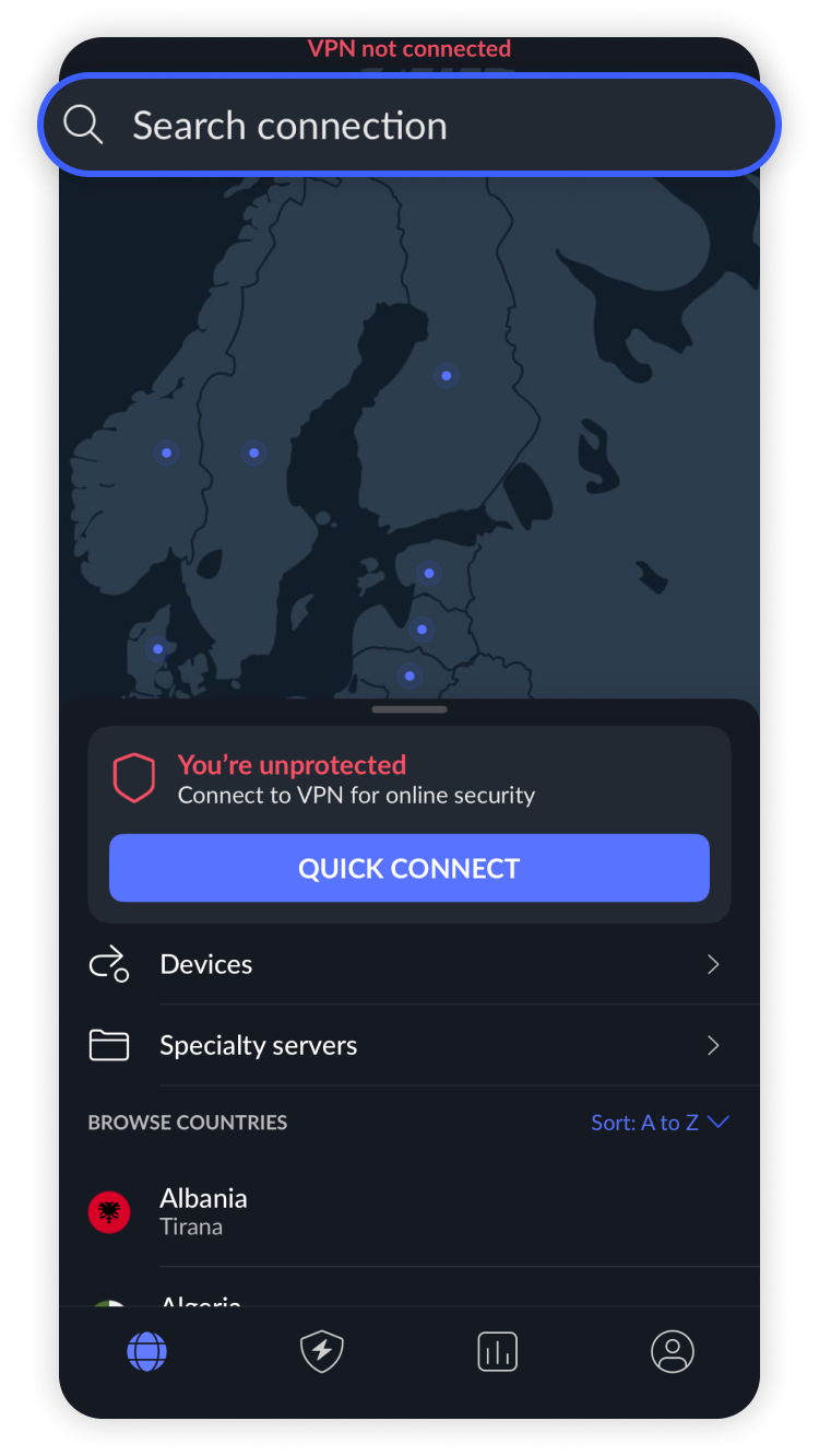 Naciśnij pinezkę kraju, a następnie Szybkie łączenie (Quick Connect), aby automatycznie połączyć się z najlepszym dla Ciebie serwerem w tym