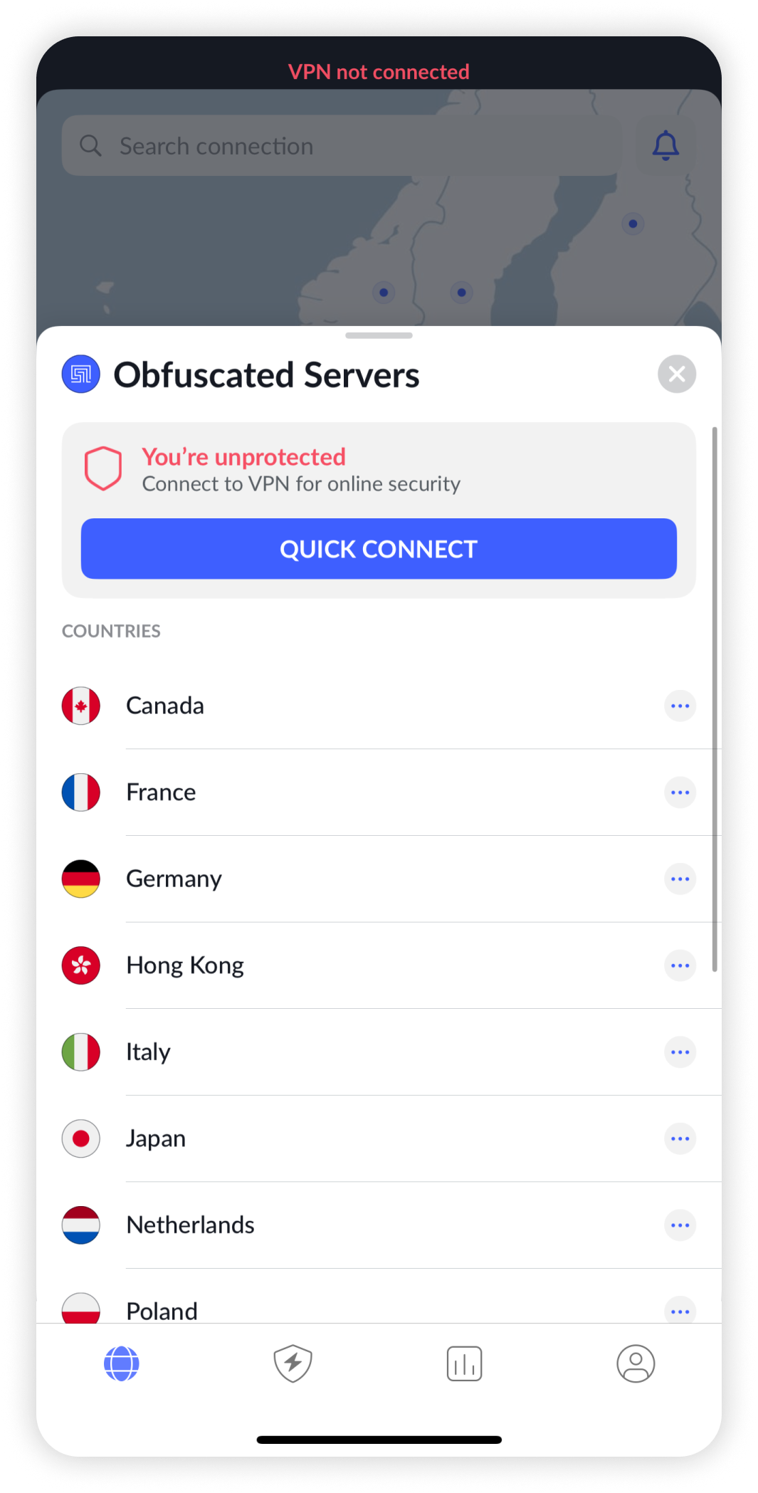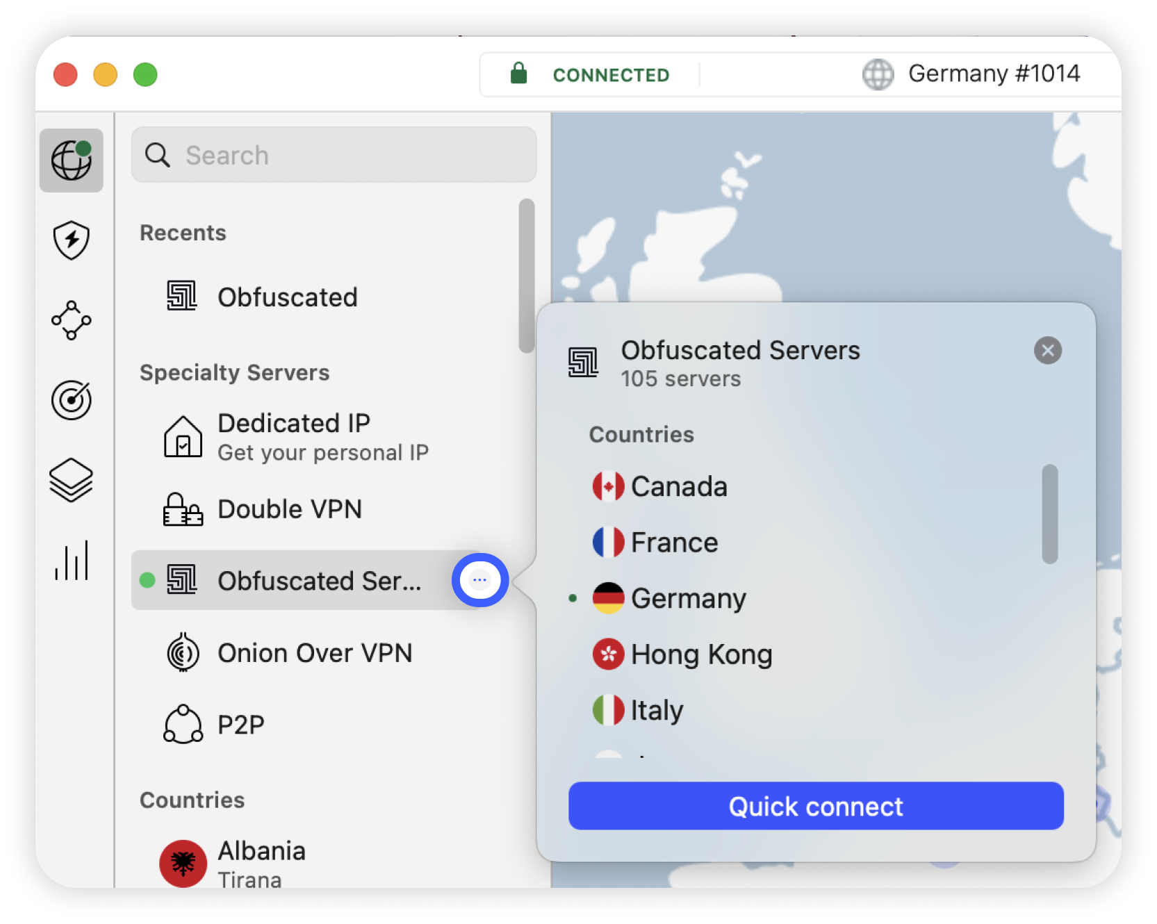 Jeśli chcesz połączyć się z konkretnym krajem, kliknij trzy kropki obok opcji Serwery maskowane (Obfuscated servers) i wybierz kraj.