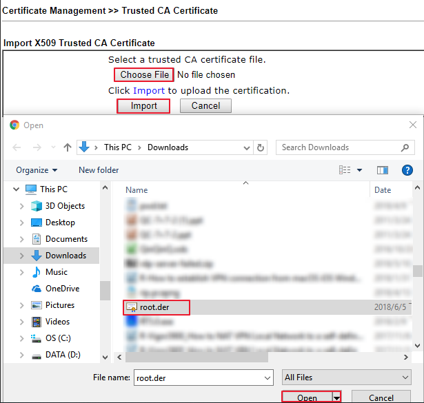 - Przejdź do Certificate Management >> Trusted CA Certificate.Kliknij IMPORT.