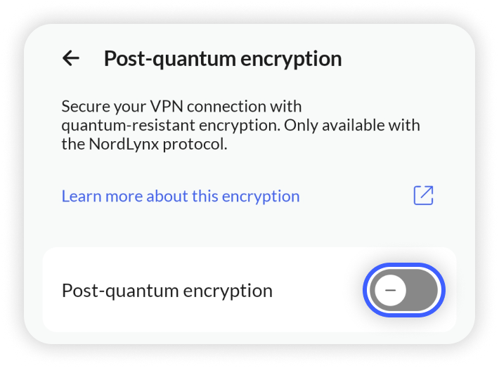 Szyfrowanie postkwantowe zabezpiecza Twoje połączenie VPN przed potencjalnymi atakami z komputerów kwantowych. Obecnie takie szyfrowanie jest dostępne tylko z protokołem NordLynx, więc nie będzie włączone z innymi protokołami, dedykowanym adresem IP, serwerami maskowanymi czy Meshnet..