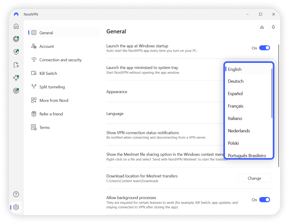 Depois de concluir os passos, o idioma do seu aplicativo da NordVPN será atualizado para o que você selecionou.
