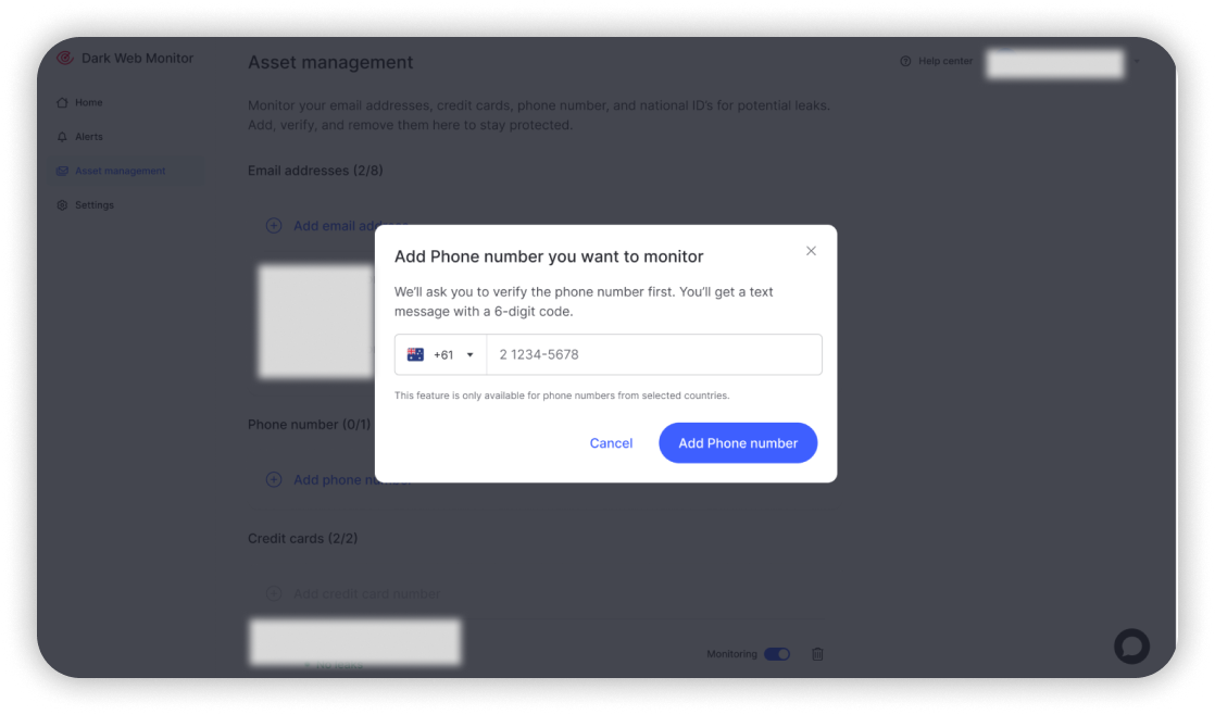 OBSERVAÇÃO: se o botão estiver cinza, você não tem o Dark Web Monitor Pro™ ou excedeu o limite de números de telefone monitorados.