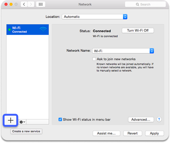 - Quando a janela da rede abrir, clique no ícone + no canto inferior esquerdo (você precisa ter privilégios de administrador).