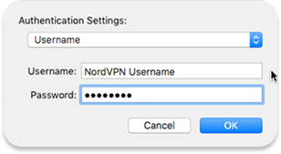 - Clique em Configurações de Autenticação (Authentication Settings). Selecione Nome de Usuário (Username) como método de autenticação e digite seu nome de usuário (username) e sua senha (password) do serviço da NordVPN. Clique em OK e depois em Aplicar (Apply).