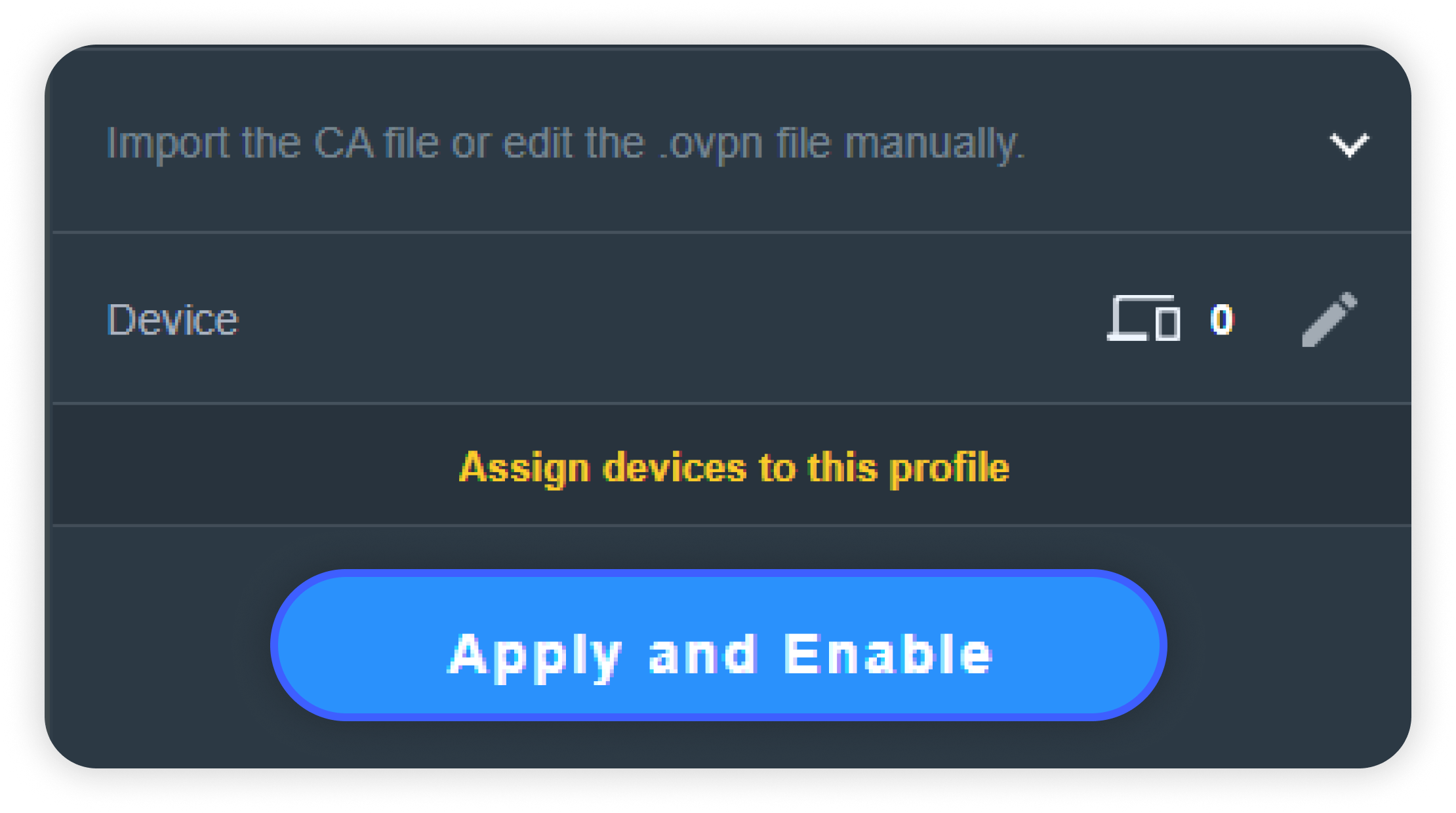 1. Depois de preencher os campos e enviar o arquivo de configuração "Import .ovpn", selecione quais dispositivos você deseja rotear pelo túnel de VPN. Para fazer isso, clique no ícone de caneta no canto superior direito, na seção Dispositivo (Device).