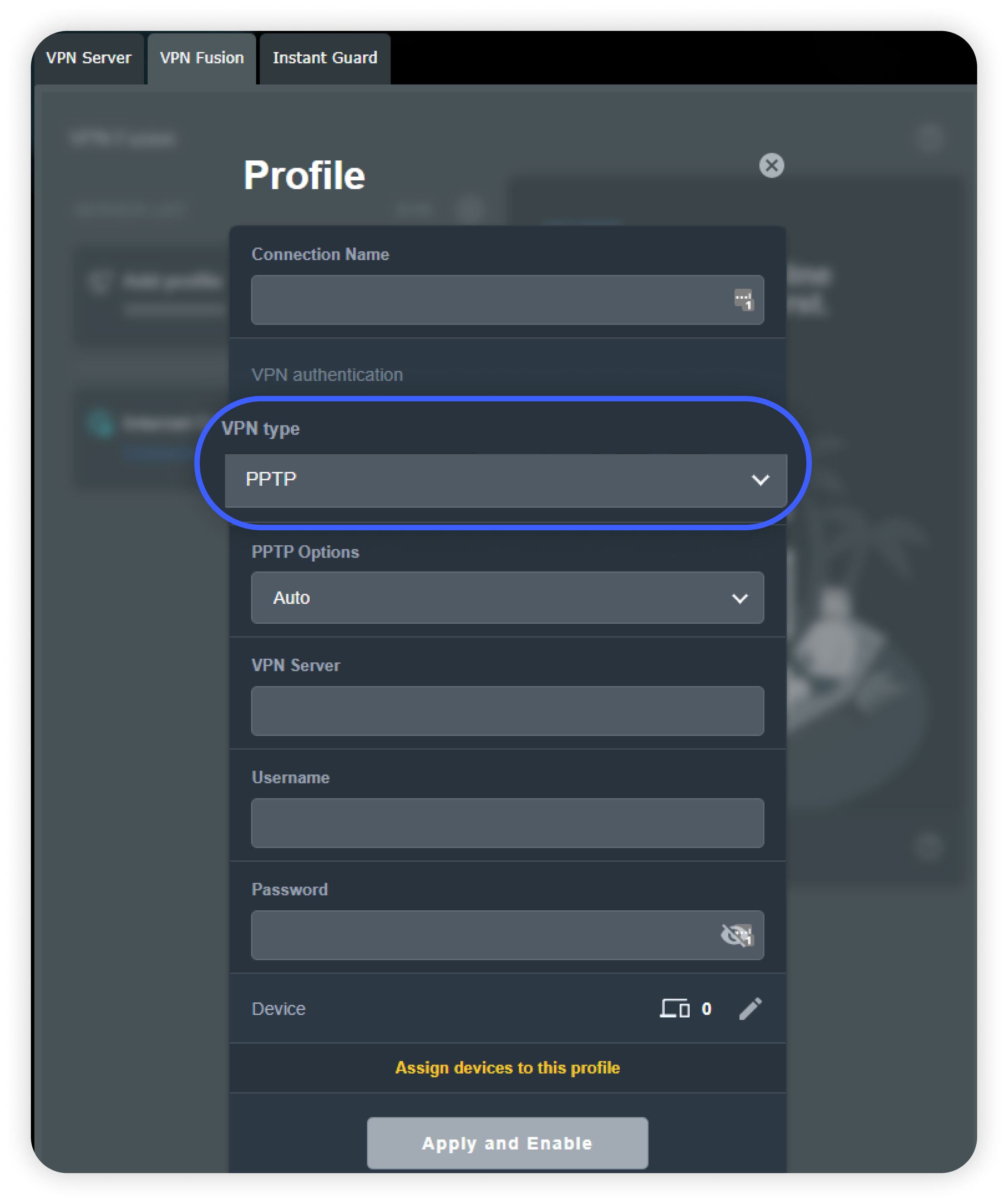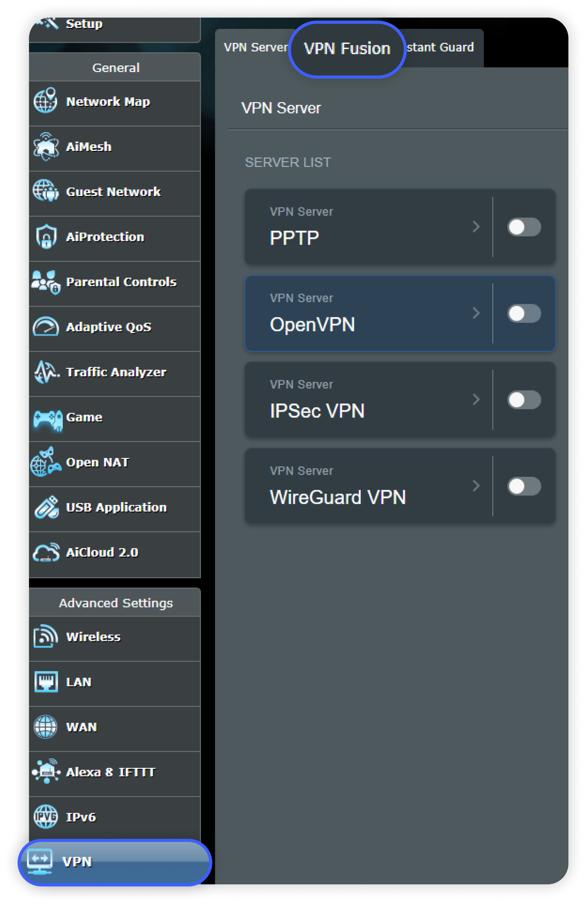 Em 2022, a Asus introduziu uma nova versão do Asus WRT para estes roteadores: ASUS ZenWiFi XT9, ROG Rapture GT-AXE11000, RT-AX88U, RT-AX86U, RT-AX86S e RT-AXE7800. Caso tenha uma versão mais antiga, siga nosso guia sobre como configurar uma conexão de VPN com firmware Asus WRT mais antigo.