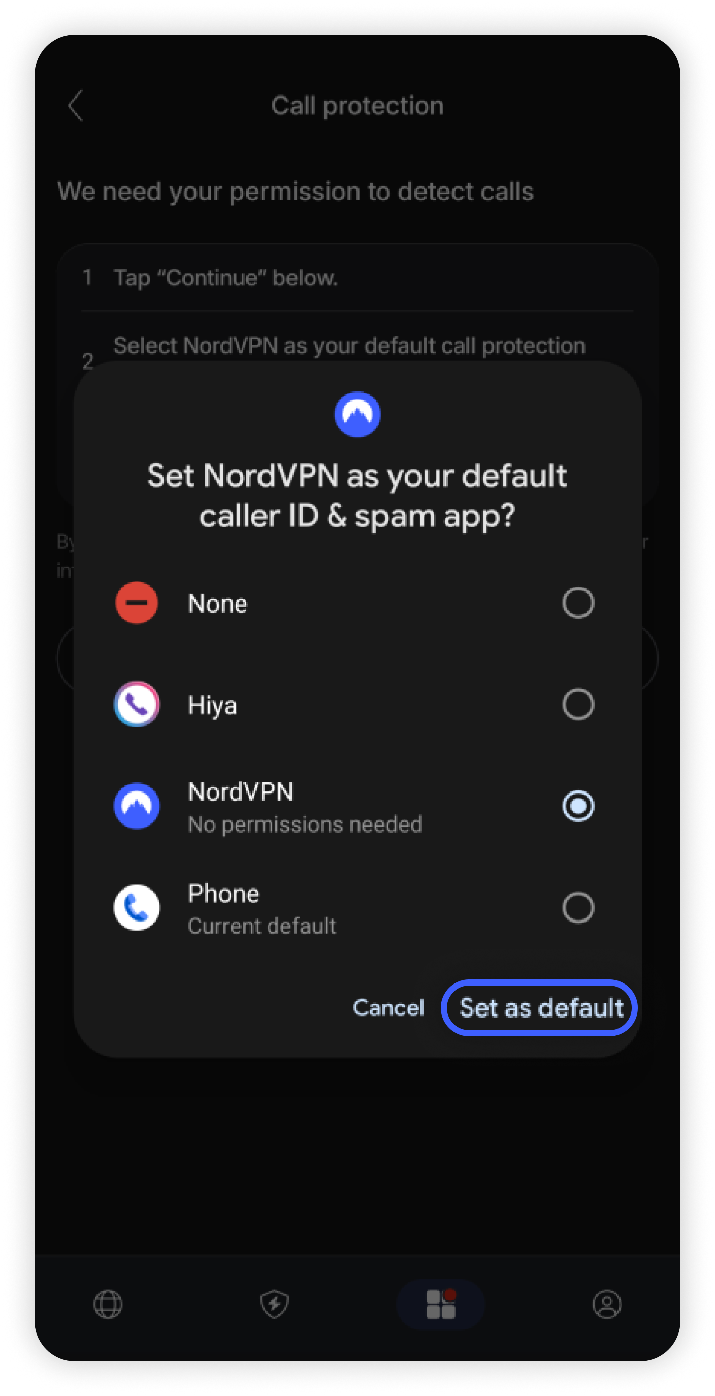 Se solicitado, deixe a NordVPN gerenciar as chamadas telefônicas.