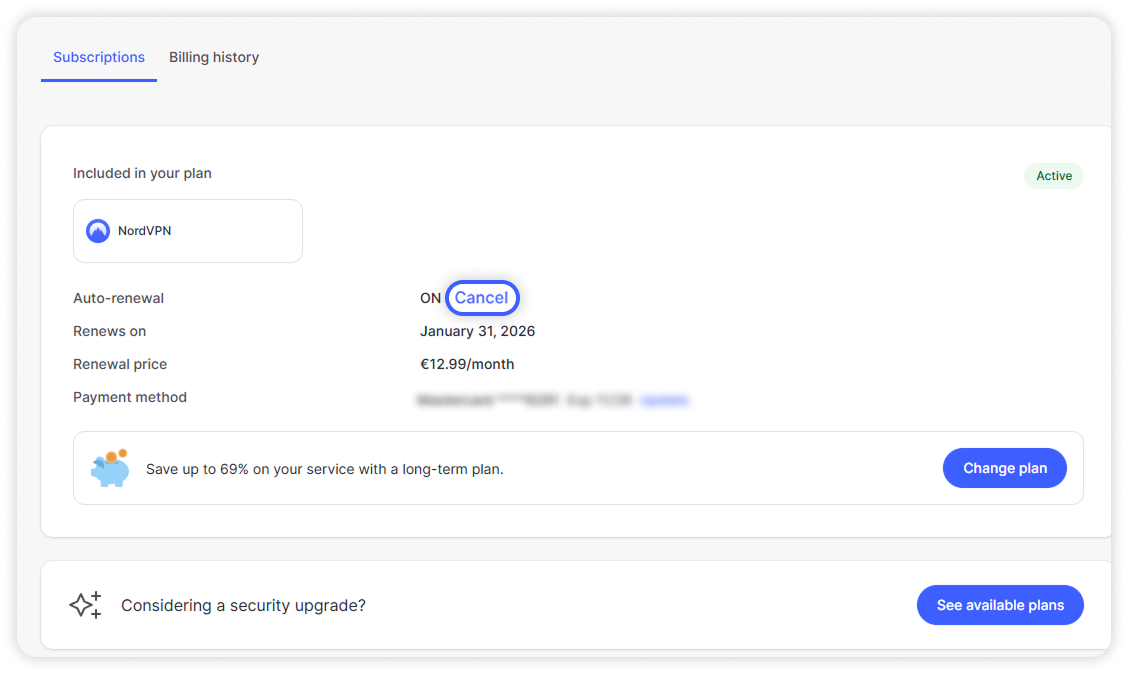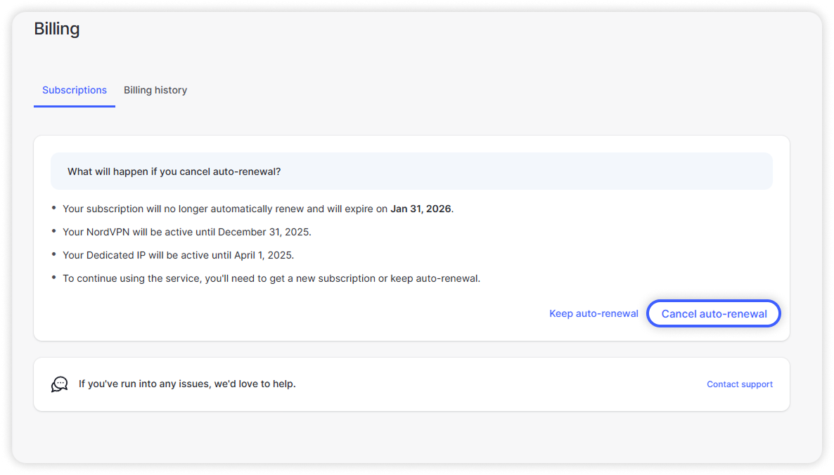 Följ stegen nedan för att avbryta den automatiska förnyelsen av din NordVPN-prenumeration:
