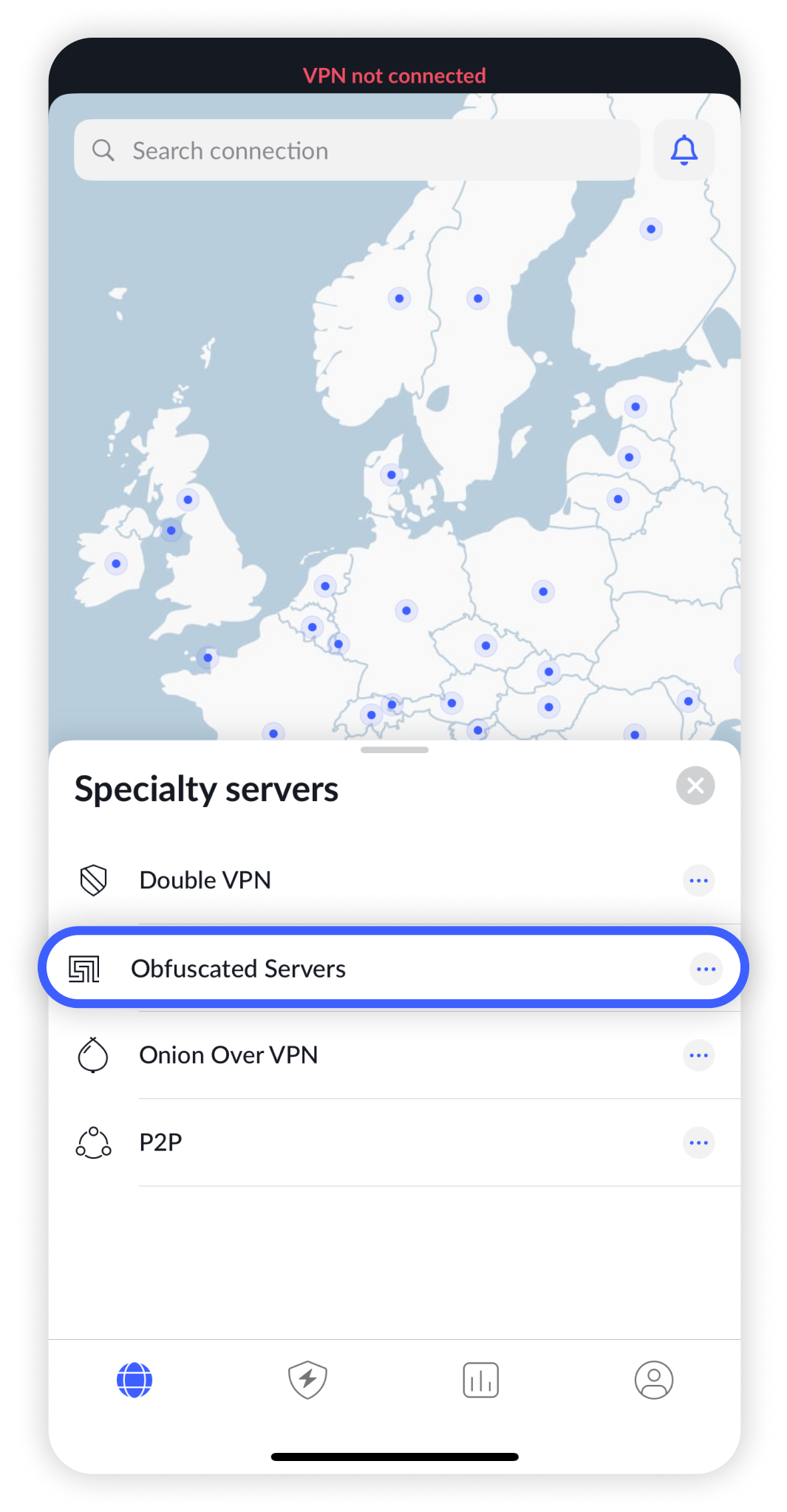 Obs: NordVPN:s dolda servrar fungerar endast med protokollen OpenVPN (TCP) och OpenVPN (UDP). Om du använder NordLynx kanske du inte ser Dolda servrar-alternativet i din NordVPN-app – eller så är det gråtonat. Om så är fallet och du vill ansluta till dolda servrar kan du ändra VPN-protokoll.