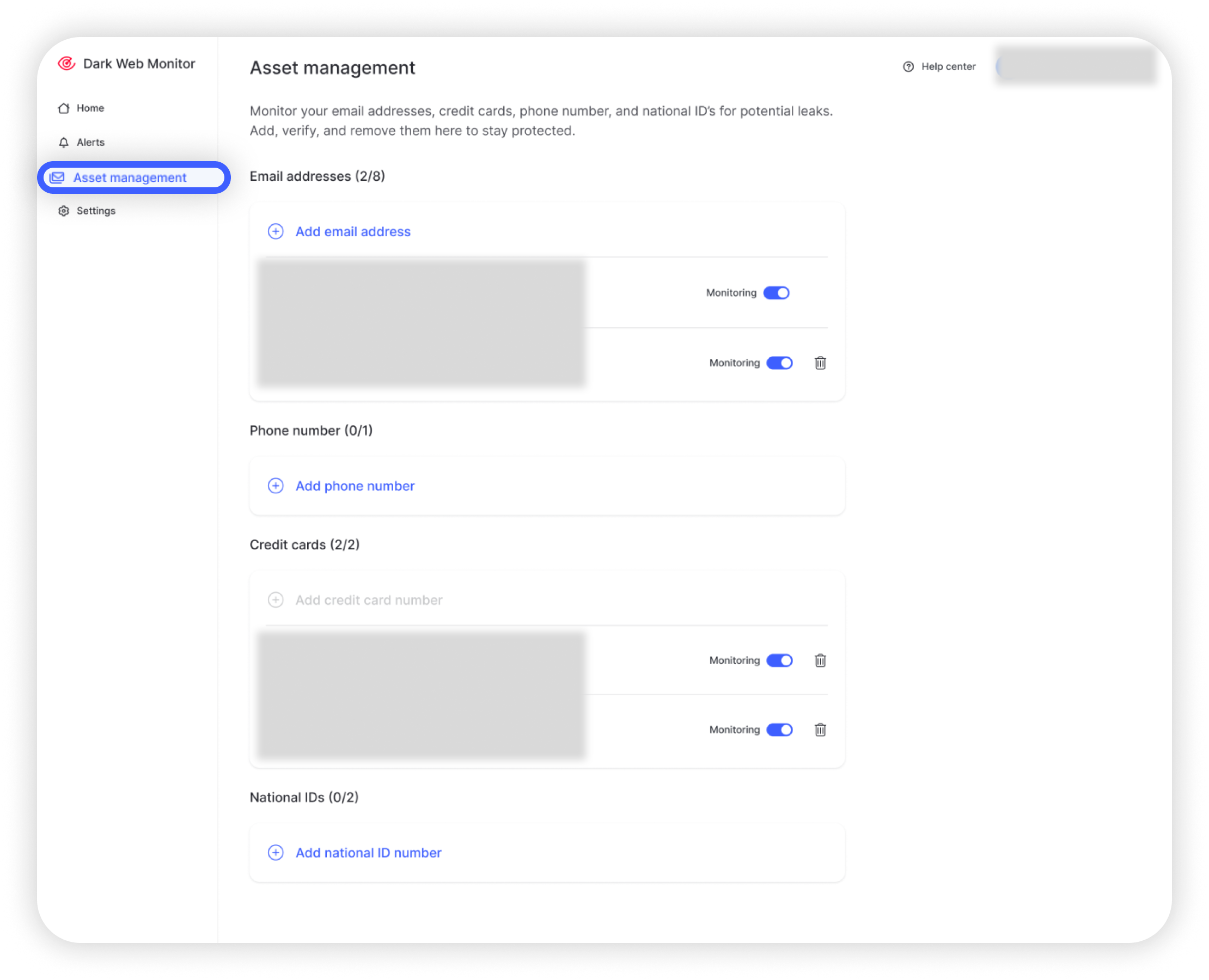 - Gå till Hantering av tillgångar via din NordVPN-app eller via Dark Web Monitor-sidan i ditt Nord Account.